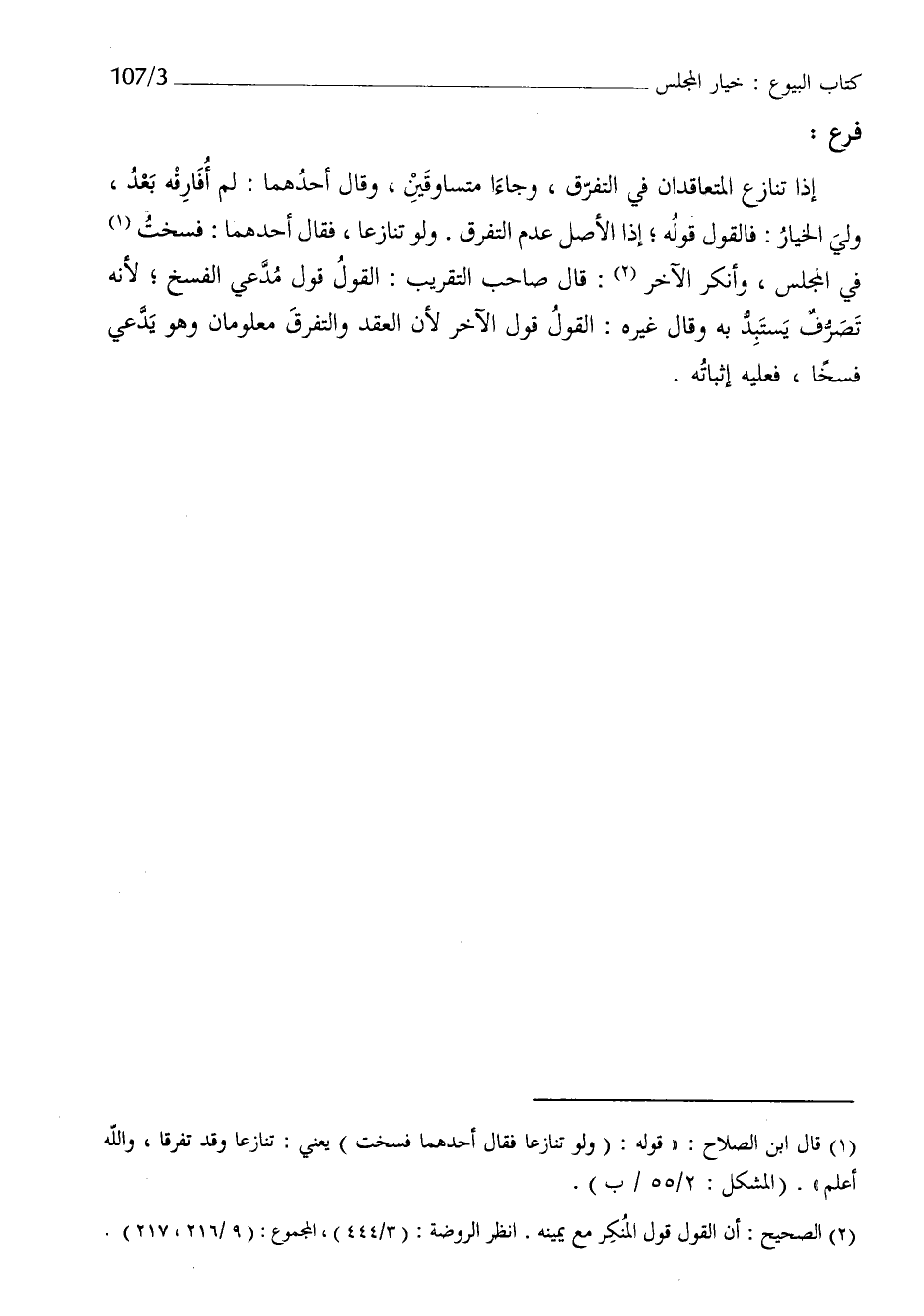 إِذا تنَازع المتعاقدان فِي التَّفَرُّق وجاءا متساوقين وَقَالَ أَحدهمَا لم أفارقه بعد ولي الْخِيَار فَالْقَوْل قَوْله إِذا الأَصْل عدم التَّفَرُّق وَلَو تنَازعا فَقَالَ أَحدهمَا فسخت فِي الْمجْلس وَأنكر الآخر قَالَ صَاحب التَّقْرِيب القَوْل قَول مدعي الْفَسْخ لِأَنَّهُ تصرف يستبد بِهِ وَقَالَ غَيره القَوْل قَول الآخر لِأَن العقد والتفرق معلومان وَهُوَ يَدعِي فسخا فَعَلَيهِ إثْبَاته