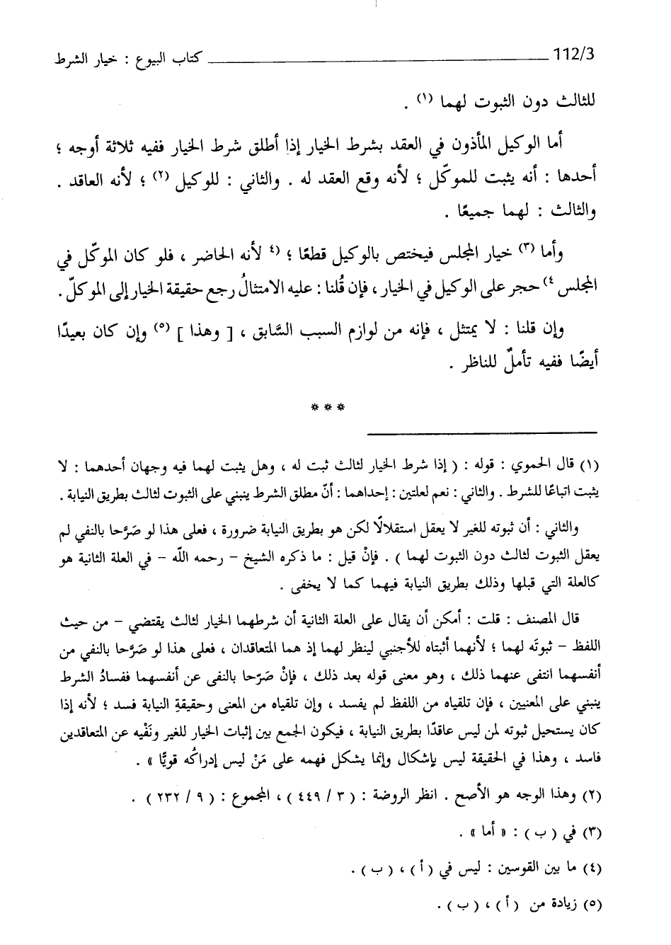 للثَّالِث دون الثُّبُوت لَهما أما الْوَكِيل الْمَأْذُون فِي العقد بِشَرْط الْخِيَار إِذا أطلق شَرط الْخِيَار فَفِيهِ ثَلَاثَة أوجه أَحدهَا أَنه يثبت للْمُوكل لانه وَقع العقد لَهُ وَالثَّانِي للْوَكِيل لانه الْعَاقِد وَالثَّالِث لَهما جَمِيعًا