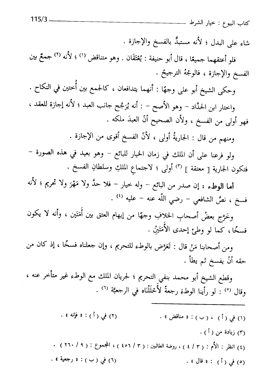 وَمن أَصْحَابنَا من قَالَ تعرض بِالْوَطْءِ للتَّحْرِيم وان جَعَلْنَاهُ فسخا إِذْ كَانَ من حَقه أَن يفْسخ ثمَّ يطَأ