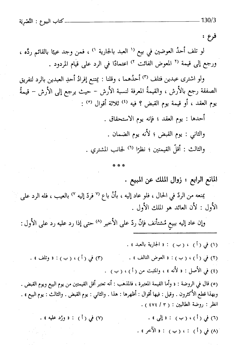 لَو تلف أحد الْعِوَضَيْنِ فِي بيع العَبْد بالجارية فَمن وجد عَيْبا بالقائم رده وَرجع إِلَى قيمَة المعوض الْفَائِت اعْتِمَادًا فِي الرَّد على قيام الْمَرْدُود