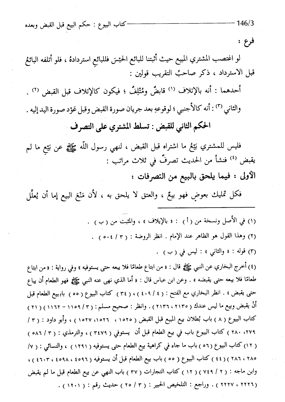 فَلَيْسَ للْمُشْتَرِي بيع مَا اشْتَرَاهُ قبل الْقَبْض لنهي رَسُول الله صلى الله عَلَيْهِ وَسلم عَن بيع مَا لم يقبض فَنَشَأَ من الحَدِيث تصرف فِي ثَلَاث مَرَاتِب