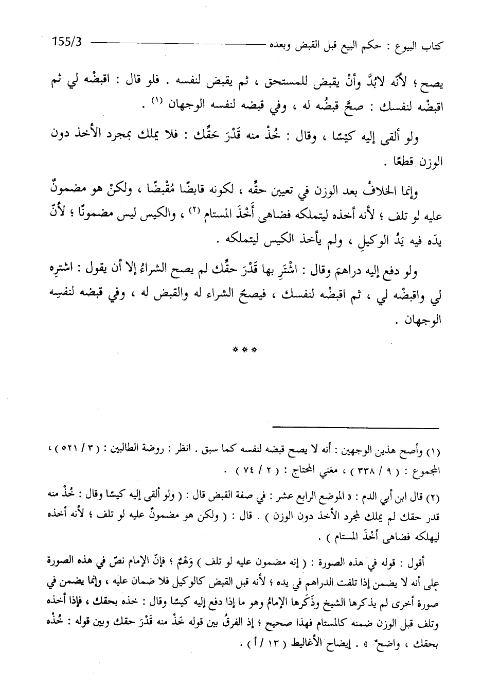 وَإِنَّمَا الْخلاف بعد الْوَزْن فِي تعْيين حَقه لكَونه قَابِضا قبضا وَلَكِن هُوَ مَضْمُون عَلَيْهِ لَو تلف لِأَنَّهُ أَخذه ليتملكه فضاهى اخذ المستام والكيس لَيْسَ مَضْمُونا لِأَن يَده فِيهِ يَد الْوَكِيل وَلم يَأْخُذ الْكيس ليتملكه