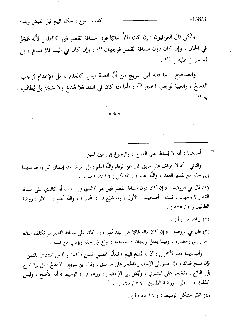 وَلَكِن قَالَ الْعِرَاقِيُّونَ إِن كَانَ المَال غَائِبا فَوق مَسَافَة الْقصر فَهُوَ كالفلس لِأَنَّهُ عجز فِي الْحَال وَإِن كَانَ دون مَسَافَة الْقصر فَوَجْهَانِ وَإِن كَانَ فِي الْبَلَد فَلَا فسخ بل يحْجر عَلَيْهِ