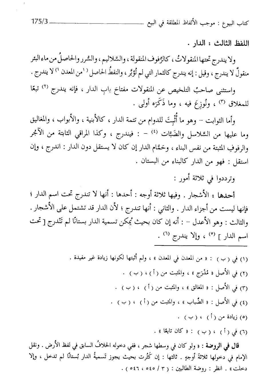 أَحدهَا الاشجار وفيهَا ثَلَاثَة اوجه احدها انها لَا تندرج تَحت اسْم الدَّار فانها لَيست من اجزاء الدَّار وَالثَّانِي انها تندرج لِأَن الدَّار قد تشْتَمل على الاشجار وَالثَّالِث وَهُوَ الأعدل أَنه إِن كَانَ بِحَيْثُ يُمكن تَسْمِيَة الدَّار بستانا لم تندرج تَحت اسْم الدَّار وَإِلَّا ينْدَرج