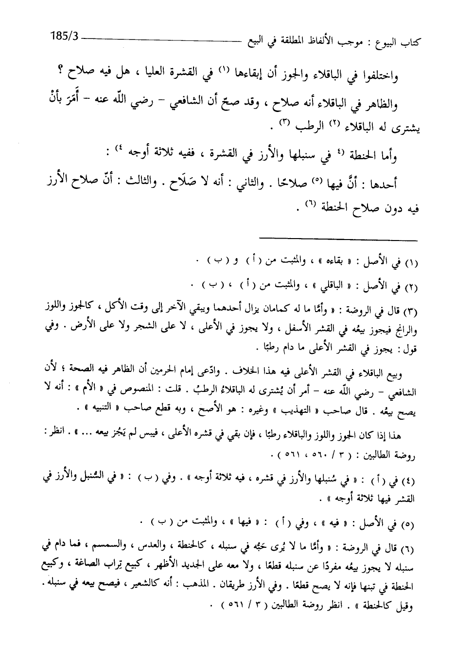 وَاخْتلفُوا فِي الباقلاء والجوز ان ابقاءها فِي القشرة الْعليا هَل فِيهِ صَلَاح وَالظَّاهِر فِي الباقلاء انه صَلَاح وَقد صَحَّ ان الشَّافِعِي رَضِي الله عَنهُ أَمر بِأَن يشترى لَهُ الباقلاء الرطب