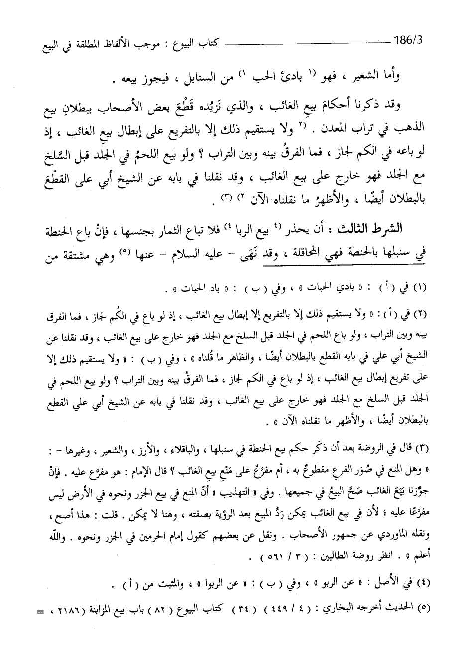 الشَّرْط الثَّالِث ان يحذر بيع الرِّبَا فَلَا تبَاع الثِّمَار بجنسها فان بَاعَ الْحِنْطَة فِي سنبلها بِالْحِنْطَةِ فَهِيَ المحاقلة وَقد نهى عَلَيْهِ السَّلَام عَنْهَا وَهِي مُشْتَقَّة من