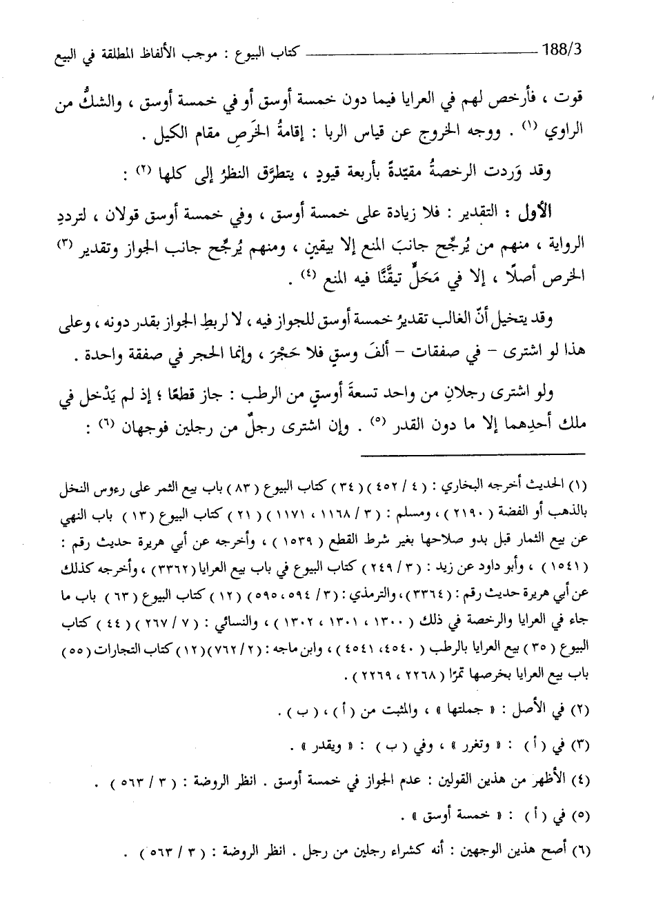 الاول التَّقْدِير فَلَا زِيَادَة على خَمْسَة أوسق وَفِي خَمْسَة أوسق قَولَانِ لتردد الراوية مِنْهُم من يرجح جَانب الْمَنْع الا بِيَقِين وَمِنْهُم يرجح جَانب الْجَوَاز وَتَقْدِير الْخرص أصلا إِلَّا فِي مَحل تَيَقنا فِيهِ الْمَنْع
