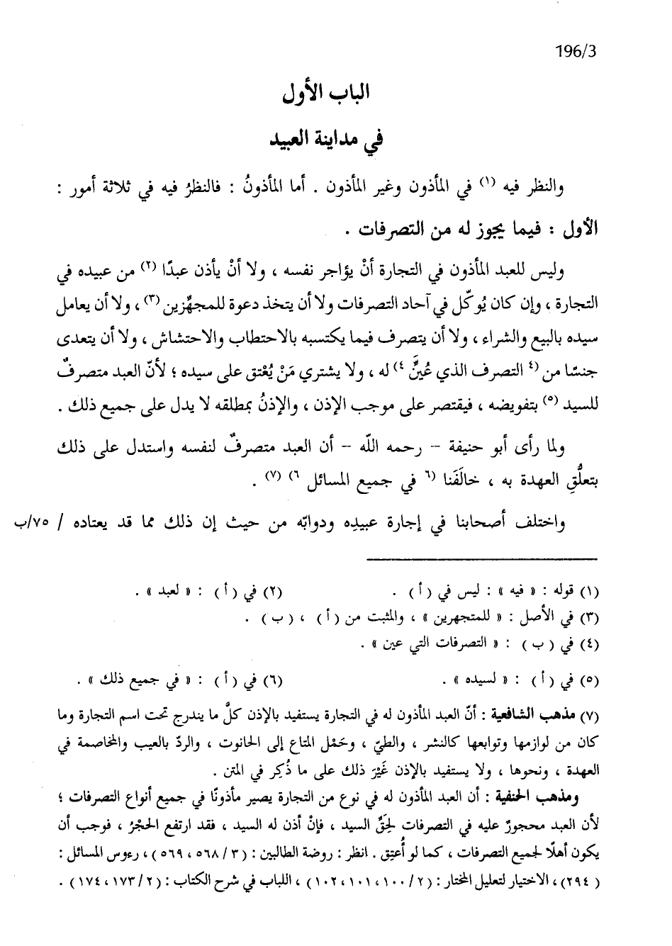 الأول فِيمَا يجوز من التَّصَرُّفَات وَلَيْسَ للْعَبد الْمَأْذُون فِي التِّجَارَة أَن يُؤَاجر نَفسه وَلَا ان يَأْذَن عبدا من عبيده فِي التِّجَارَة وان كَانَ يُوكل فِي احاد التَّصَرُّفَات وَلَا ان يتَّخذ دَعْوَة للمجهزين وَلَا ان يُعَامل سَيّده بِالْبيعِ وَالشِّرَاء وَلَا ان يتَصَرَّف فِيمَا يكتسبه بالاحتطاب والاحتشاش وَلَا ان يتَعَدَّى جِنْسا من التَّصَرُّف الَّذِي عين لَهُ وَلَا يَشْتَرِي من يعْتق على سَيّده لِأَن العَبْد متصرف للسَّيِّد بتفويضه فَيقْتَصر على مُوجب الْإِذْن وَالْإِذْن بمطلقه لَا يدل على جَمِيع ذَلِك