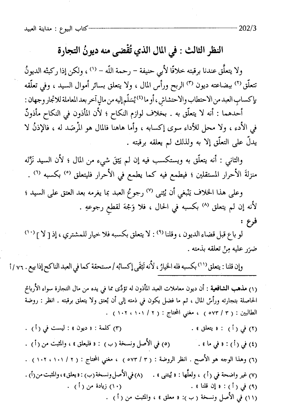 وَلَا يتَعَلَّق عندنَا بِرَقَبَتِهِ خلافًا لأبي حنيفَة رَحمَه الله وَلَكِن إِذا ركبته الدُّيُون تتَعَلَّق ببضاعته دُيُون الأربح وَرَأس المَال وَلَا يتَعَلَّق بِسَائِر أَمْوَال السَّيِّد وَفِي تعلقه بإكساب العَبْد من الاحتطاب والاحتشاش أَو مَا يسلم إِلَيْهِ من مَال آخر بعد الْمُعَامَلَة للاتجار وَجْهَان