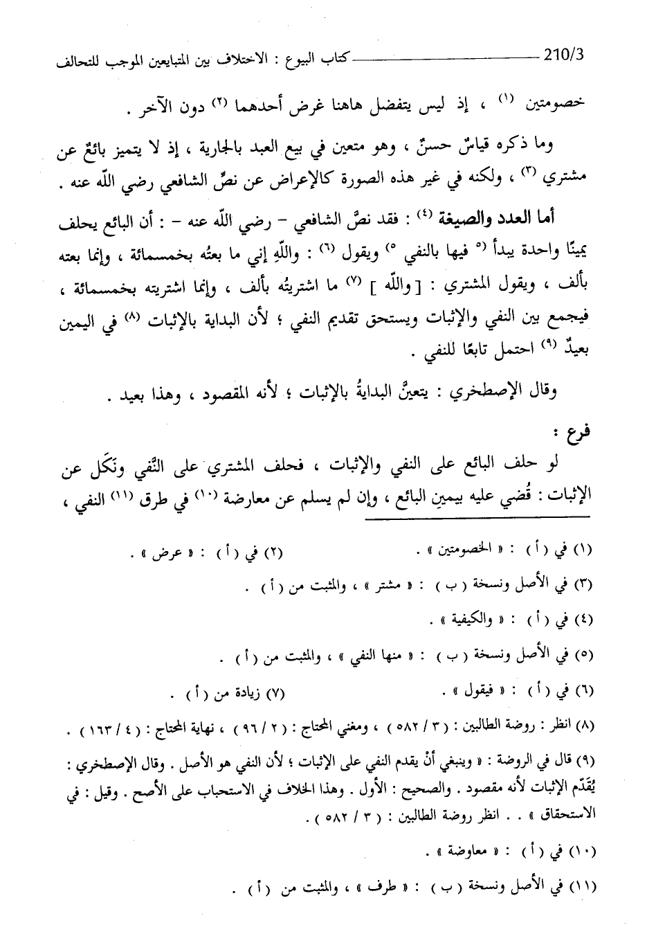 أما الْعدَد والصيغة فقد نَص الشَّافِعِي رَضِي الله عَنهُ أَن البَائِع يحلف يَمِينا وَاحِدَة يبْدَأ فِيهَا بِالنَّفْيِ وَيَقُول وَالله إِنِّي مَا بِعته بِخَمْسِمِائَة وَإِنَّمَا بِعته بِأَلف وَيَقُول المُشْتَرِي وَالله مَا اشْتَرَيْته بِأَلف وَإِنَّمَا اشْتَرَيْته بِخَمْسِمِائَة فَيجمع بَين النَّفْي وَالْإِثْبَات وَيسْتَحق تَقْدِيم لَان الْبِدَايَة بالإثبات فِي الْيَمين بعيد احْتمل تَابعا للنَّفْي