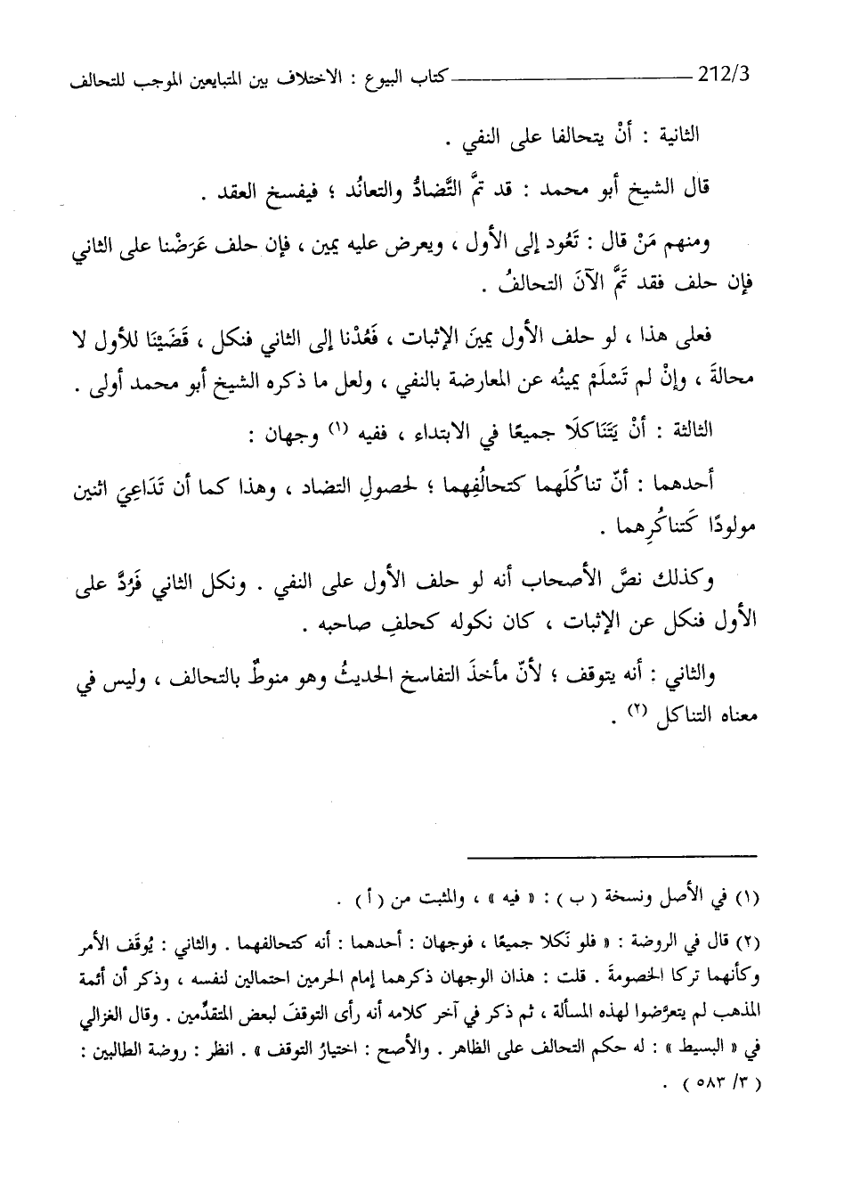 وَالثَّانِي انه يتَوَقَّف لَان مَأْخَذ التفاسخ الحَدِيث وَهُوَ مَنُوط بالتحالف وَلَيْسَ فِي مَعْنَاهُ التناكل