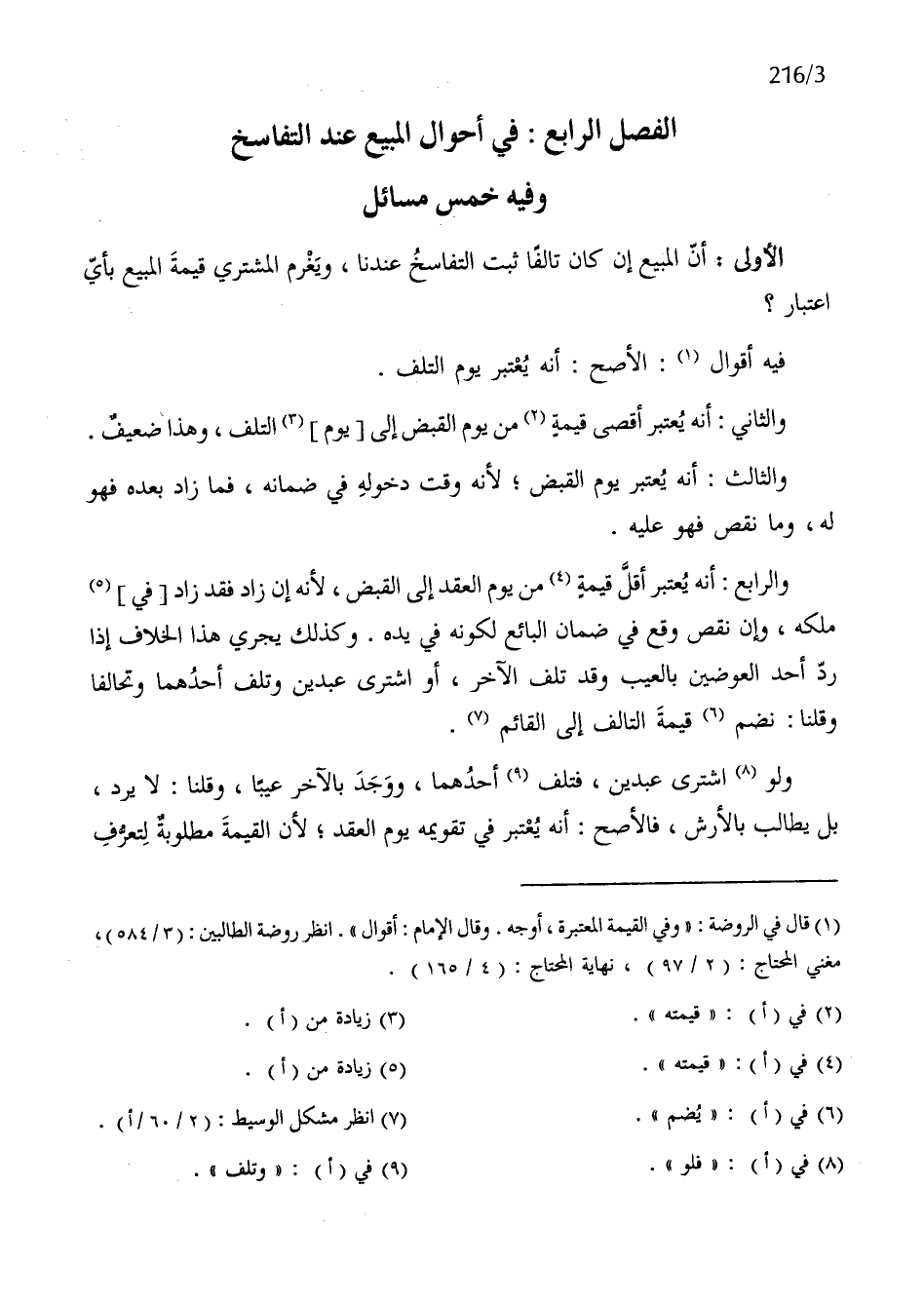 الْفَصْل الرَّابِع فِي أَحْوَال الْمَبِيع عِنْد التفاسخ وَفِيه خمس مسَائِل