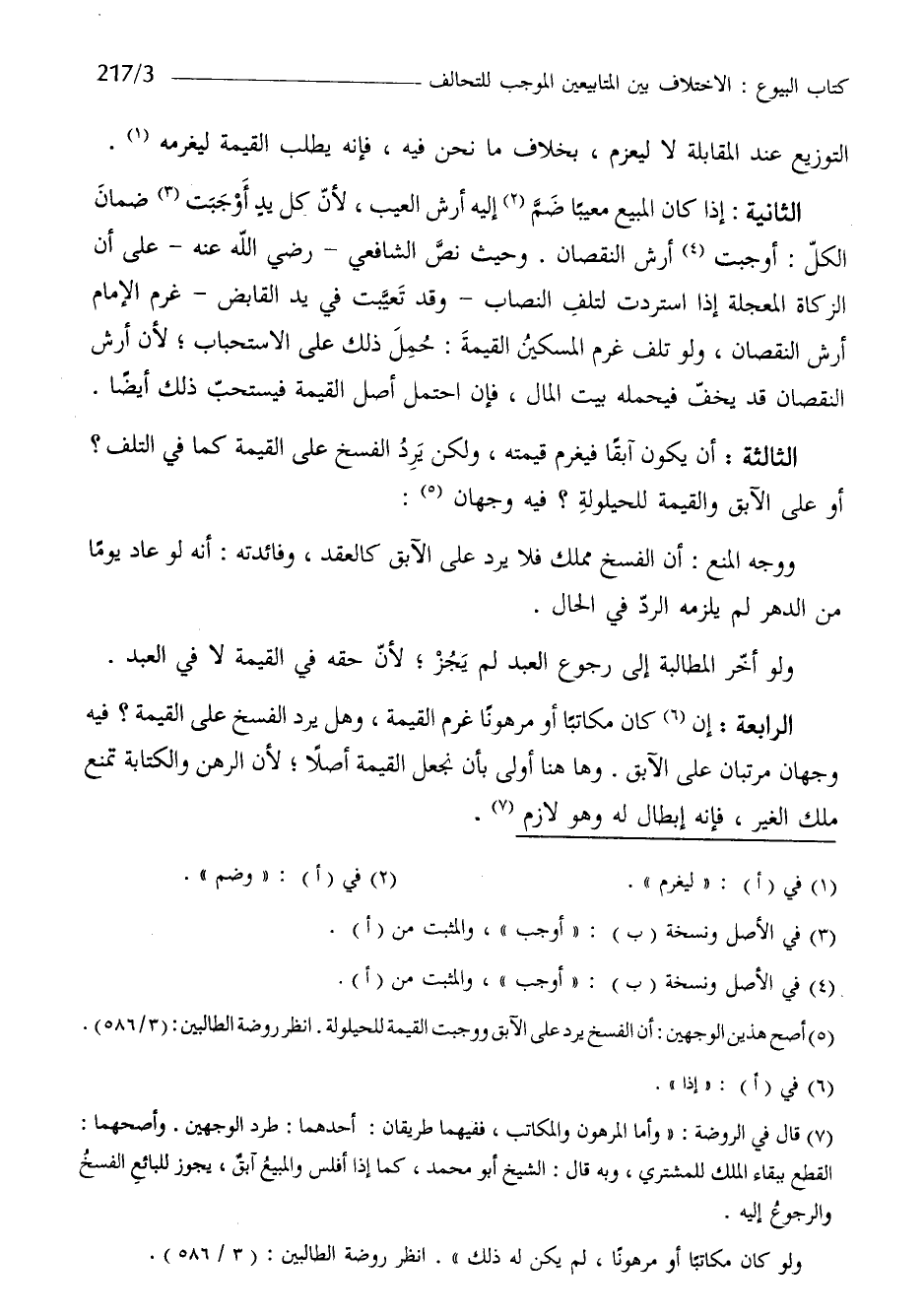 التَّوْزِيع عِنْد الْمُقَابلَة لَا ليعزم بِخِلَاف مَا نَحن فِيهِ فانه يطْلب الْقيمَة ليغرمه الثَّانِيَة إِذا كَانَ الْمَبِيع معيبا ضم إِلَيْهِ ارش الْعَيْب لَان كل يَد أوجبت ضَمَان الْكل أوجبت ارش النُّقْصَان وَحَيْثُ نَص الشَّافِعِي رَضِي الله عَنهُ على أَن الزَّكَاة المعجلة إِذا استردت لتلف النّصاب وَقد تعيبت فِي يَد الْقَابِض غرم الإِمَام ارش النُّقْصَان وَلَو تلف غرم الْمِسْكِين القيمه حمل ذَلِك على الأستحباب لِأَن أرش النُّقْصَان قد يخف فيحمله بَيت المَال فان احْتمل اصل الْقيمَة فَيُسْتَحَب ذَلِك أَيْضا الثَّالِثَة أَن يكون آبقا فَيغرم قِيمَته وَلَكِن يرد الْفَسْخ على الْقيمَة كَمَا فِي التّلف أَو على الْآبِق وَالْقيمَة للْحَيْلُولَة فِيهِ وَجْهَان
