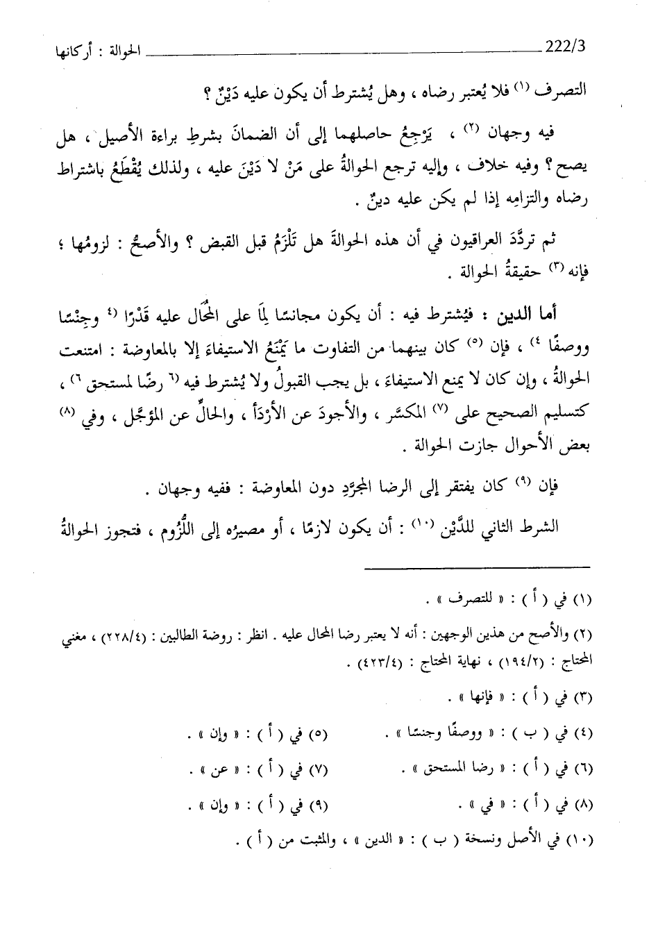 أما الدّين فَيشْتَرط فِيهِ أَن يكون مجانسا لما على الْمحَال عَلَيْهِ قدرا وجنسا ووصفا فان كَانَ بَينهمَا من التَّفَاوُت مَا يمْنَع الِاسْتِيفَاء إِلَّا بالمعاوضة امْتنعت الْحِوَالَة وان كَانَ لَا يمْنَع الِاسْتِيفَاء بل يجب الْقبُول وَلَا يشْتَرط فِيهِ رضَا لمستحق كتسليم الصَّحِيح على المكسر والأجود عَن الأردأ وَالْحَال عَن الْمُؤَجل وَفِي بعض الْأَحْوَال جَازَت الْحِوَالَة