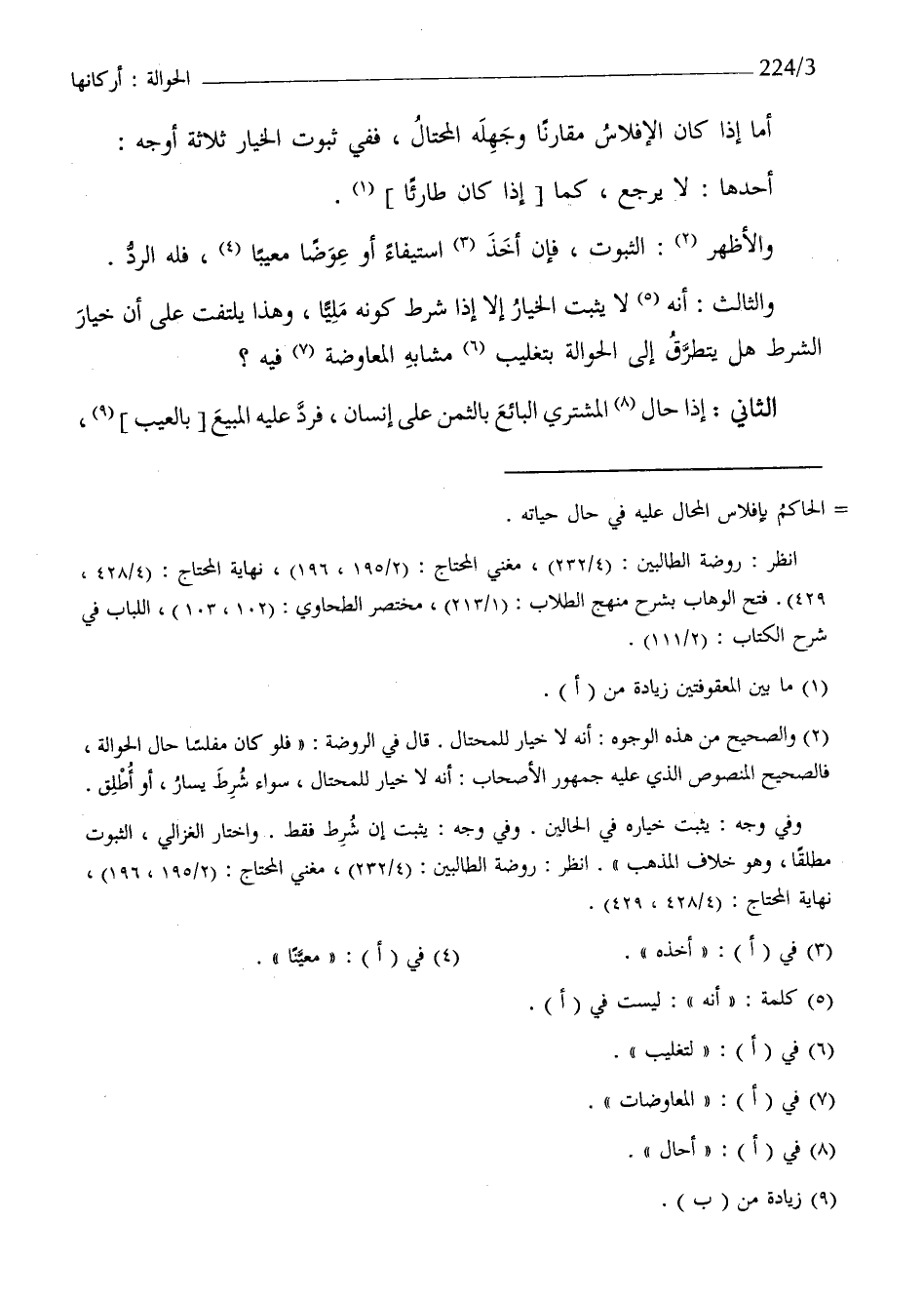 وَالثَّالِث انه لَا يثبت الْخِيَار إِلَّا إِذا شَرط كَونه مَلِيًّا وَهَذَا يلْتَفت على أَن الْخِيَار الشَّرْط هَل يتَطَرَّق إِلَى الْحِوَالَة بتغليب مشابه الْمُعَاوضَة فِيهِ