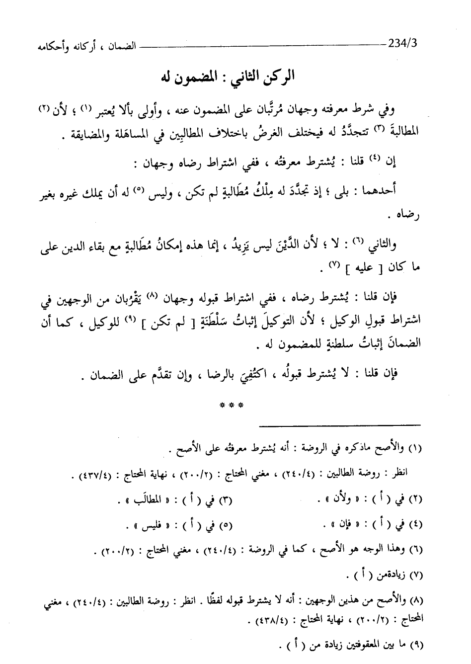 وَفِي شَرط مَعْرفَته وَجْهَان مرتبان على الْمَضْمُون عَنهُ واولى بَالا يعْتَبر لَان الْمُطَالبَة تتجدد لَهُ فيختلف الْغَرَض باخْتلَاف المطالبين فِي المساهلة والمضايقة