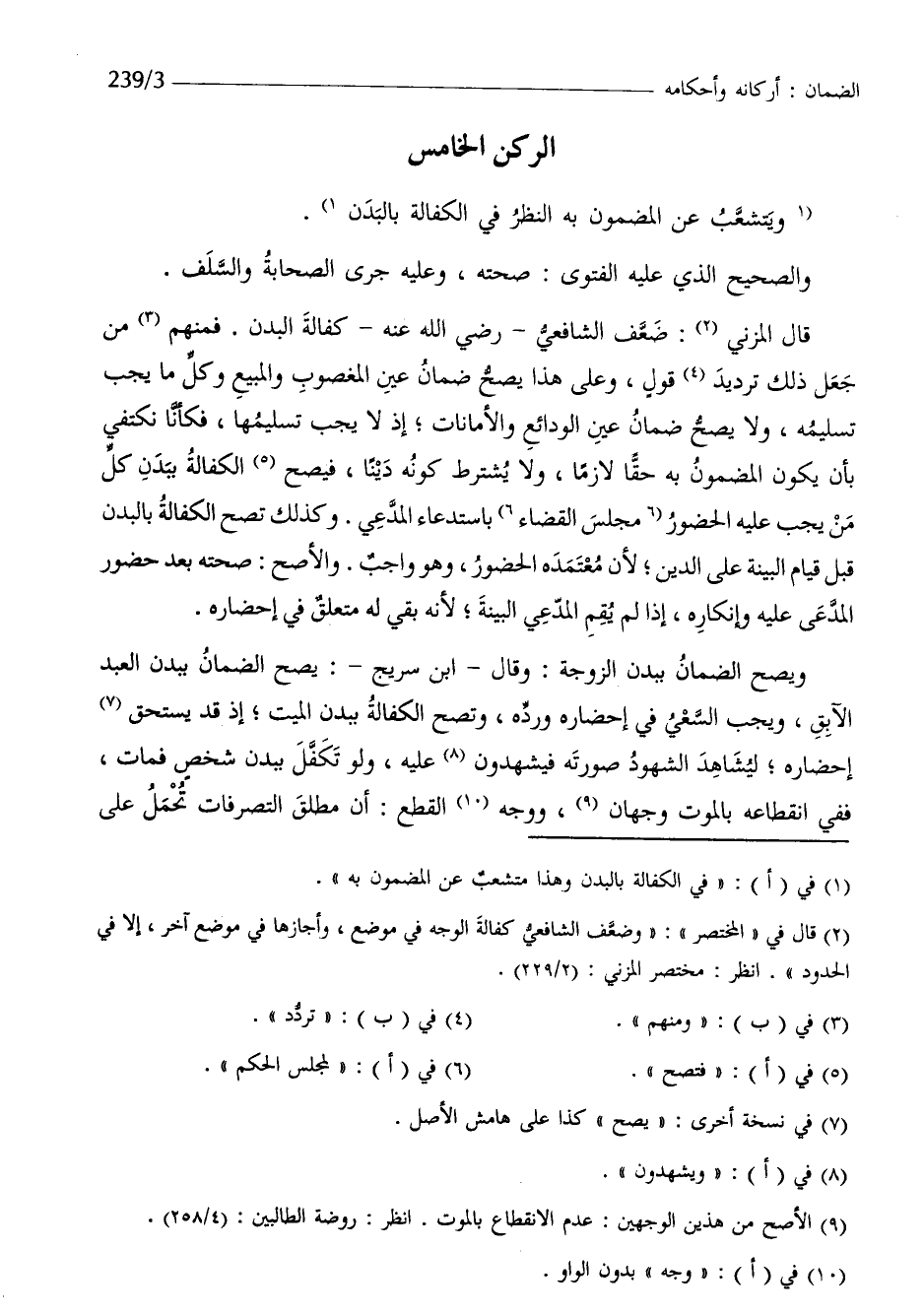 قَالَ الْمُزنِيّ ضعف الشَّافِعِي رَضِي الله عَنهُ كَفَالَة الْبدن فَمنهمْ من جعل ذَلِك ترديد قَول وعَلى هَذَا يَصح ضَمَان عين الْمَغْصُوب وَالْمَبِيع وكل مَا يجب تَسْلِيمه وَلَا يَصح ضَمَان عين الودائع والامانات اذ لَا يجب تَسْلِيمهَا فكأنا نكتفي بَان يكون الْمَضْمُون بِهِ حَقًا لَازِما وَلَا يشْتَرط كَونه دينا فَيصح الْكفَالَة ببدن كل من يجب عَلَيْهِ الْحُضُور مجْلِس الْقَضَاء باستدعاء الْمُدَّعِي وَكَذَلِكَ تصح الْكفَالَة بِالْبدنِ قبل قيام الْبَيِّنَة على الدّين لانا معتمده الْحُضُور وَهُوَ وَاجِب والاصح صِحَّته بعد حُضُور الْمُدعى عَلَيْهِ وإنكاره إِذا لم يقم الْمُدَّعِي الْبَيِّنَة لانه بَقِي لَهُ مُتَعَلق فِي إِحْضَاره