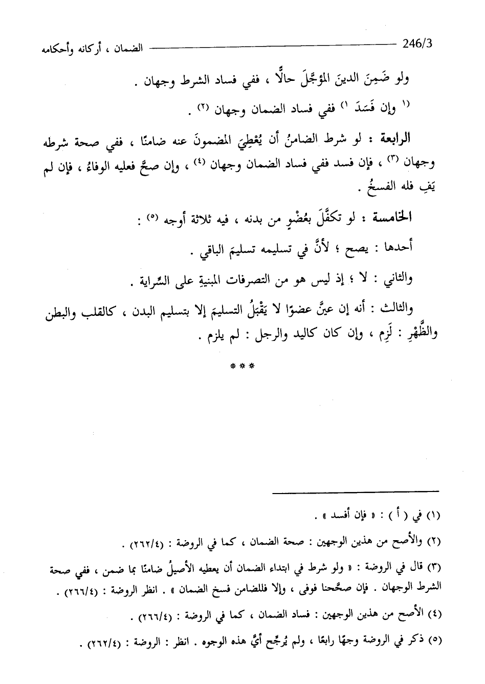 الرَّابِعَة لَو شَرط الضَّامِن ان يُعْطي الْمَضْمُون عَنهُ ضَامِنا فَفِي صِحَة شَرطه وَجْهَان فان فسد فَفِي فَسَاد الضَّمَان وَجْهَان وان صَحَّ فَعَلَيهِ الْوَفَاء فان لم يَفِ فَلهُ الْفَسْخ