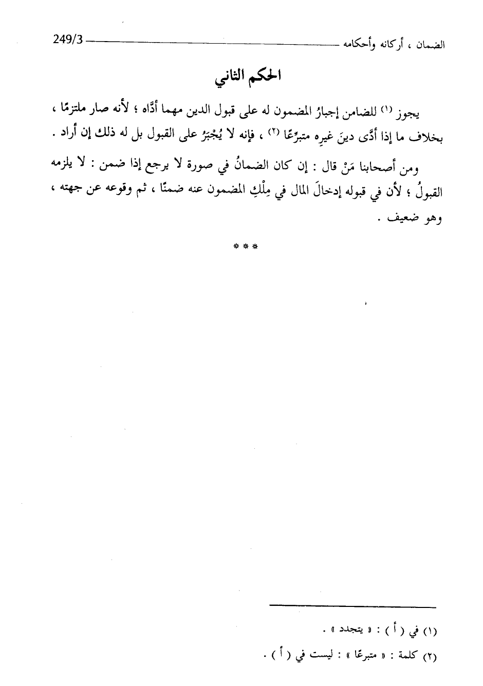يجوز للضامن إِجْبَار الْمَضْمُون لَهُ على قبُول الدّين مهما أَدَّاهُ لانه صَار مُلْتَزما بِخِلَاف مَا إِذا أدّى دين غَيره مُتَبَرعا فانه لَا يجْبر على الْقبُول بل لَهُ ذَلِك إِن أَرَادَ