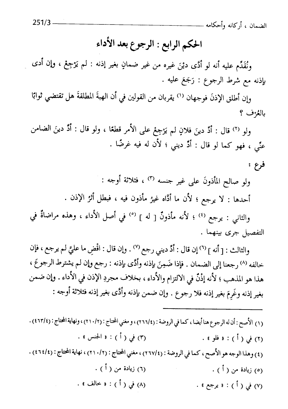 وَالثَّالِث أَنه إِن قَالَ أد ديني رَجَعَ وان قَالَ اقْضِ مَا عَليّ لم يرجع فان خَالفه رَجعْنَا إِلَى الضَّمَان فَإِذا ضمن بِإِذْنِهِ وَأدّى بِإِذْنِهِ رَجَعَ وان لم يشْتَرط الرُّجُوع هَذَا هُوَ الْمَذْهَب لانه أذن فِي الِالْتِزَام وَالْأَدَاء بِخِلَاف مُجَرّد الْإِذْن فِي الْأَدَاء وان ضمن بِغَيْر إِذْنه وَغرم بِغَيْر إِذْنه فَلَا رُجُوع وَإِن ضمن بِإِذْنِهِ وَأدّى بِغَيْر إِذْنه فَثَلَاثَة أوجه