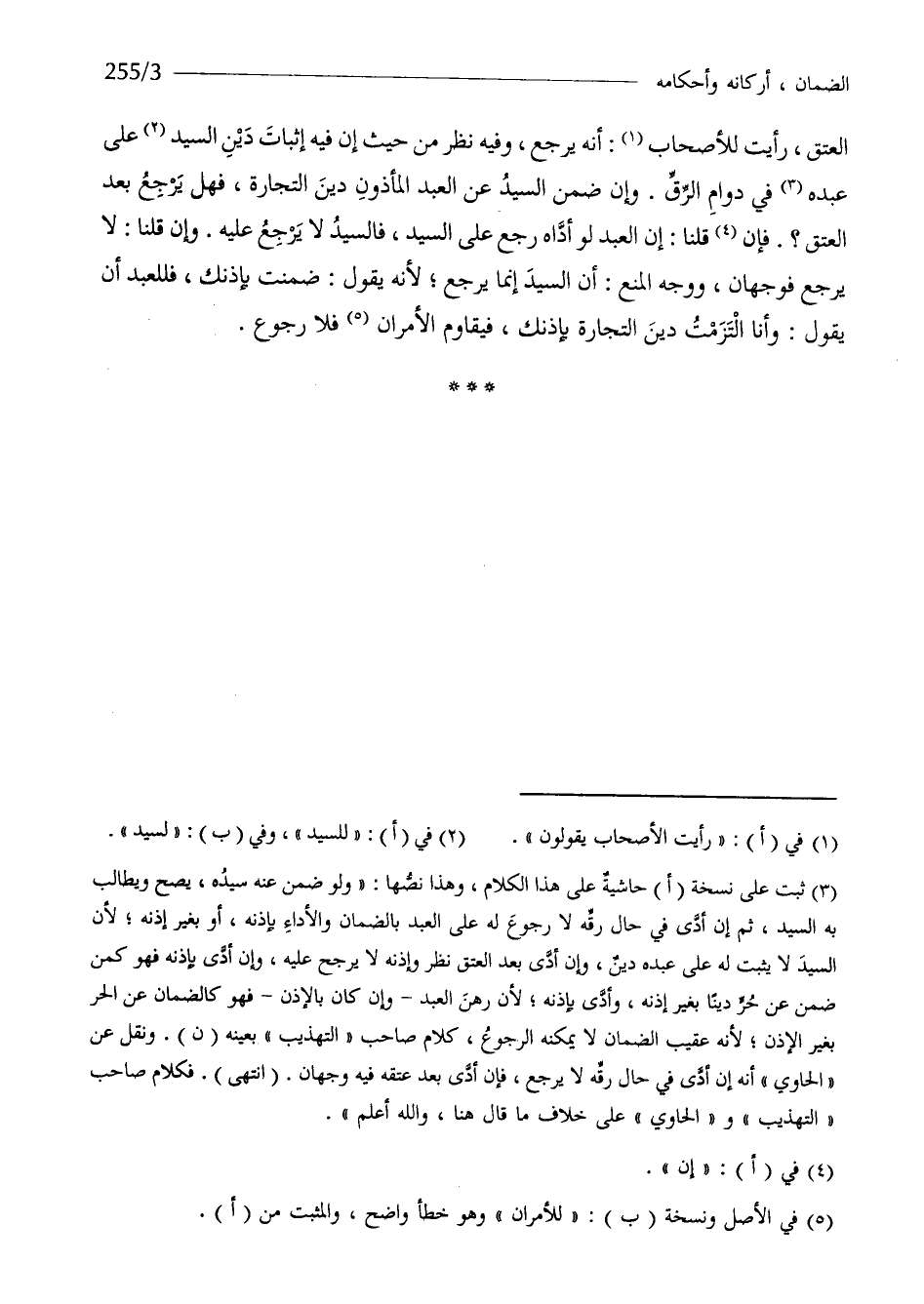 الْعتْق رَأَيْت للأصحاب انه يرجع وَفِيه نظر من حَيْثُ أَن فِيهِ إِثْبَات دين السَّيِّد على عَبده فِي دوَام الرّقّ وان ضمن السَّيِّد عَن العَبْد الْمَأْذُون دين التِّجَارَة فَهَل يرجع بعد الْعتْق فَإِن قُلْنَا إِن العَبْد لَو أَدَّاهُ رَجَعَ على السَّيِّد فالسيد لَا يرجع عَلَيْهِ وان قُلْنَا لَا يرجع فَوَجْهَانِ وَوجه الْمَنْع أَن السَّيِّد إِنَّمَا يرجع لانه يَقُول ضمنت بإذنك فللعبد أَن يَقُول وَأَنا التزمت دين التِّجَارَة بإذنك فيقاوم الْأَمْرَانِ فَلَا رُجُوع
