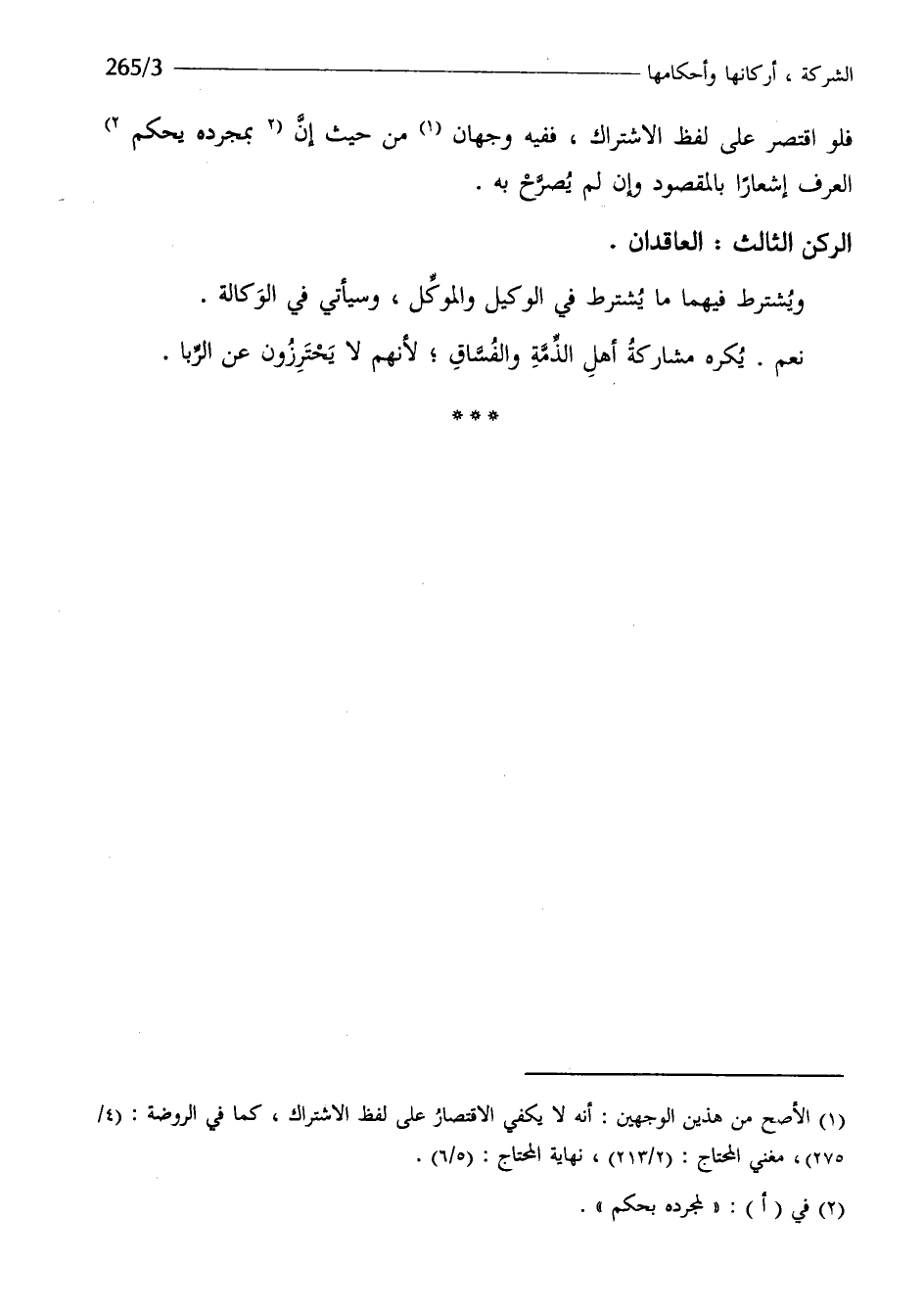 فَلَو اقْتصر على لفظ الِاشْتِرَاك فَفِيهِ وَجْهَان من حَيْثُ إِن بِمُجَرَّدِهِ يحكم الْعرف إشعارا بِالْمَقْصُودِ وَإِن لم يُصَرح بِهِ الرُّكْن الثَّالِث العاقدان