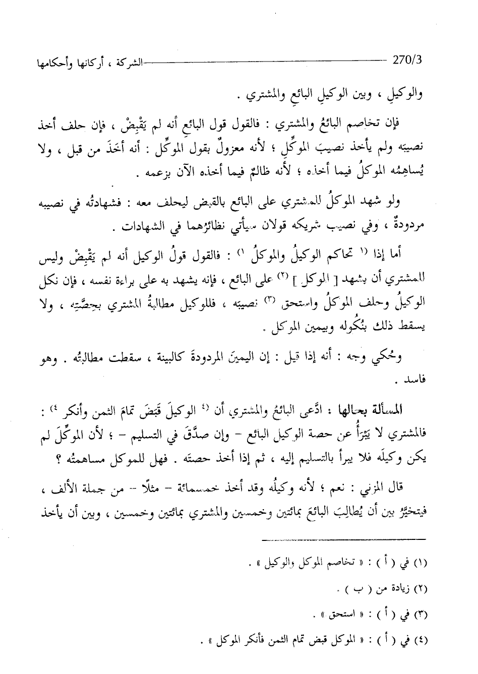 أما إِذا تحاكم الْوَكِيل وَالْمُوكل فَالْقَوْل قَول الْوَكِيل أَنه لم يقبض وَلَيْسَ للمشترى أَن يشْهد الْمُوكل على البَائِع فَإِنَّهُ يشْهد بِهِ على نَفسه فَإِن نكل الْوَكِيل وَحلف الْمُوكل وأستحق نصِيبه فللوكيل مُطَالبَة المُشْتَرِي بِحِصَّتِهِ وَلَا يسْقط ذَلِك بِنُكُولِهِ وبيمين الْمُوكل
