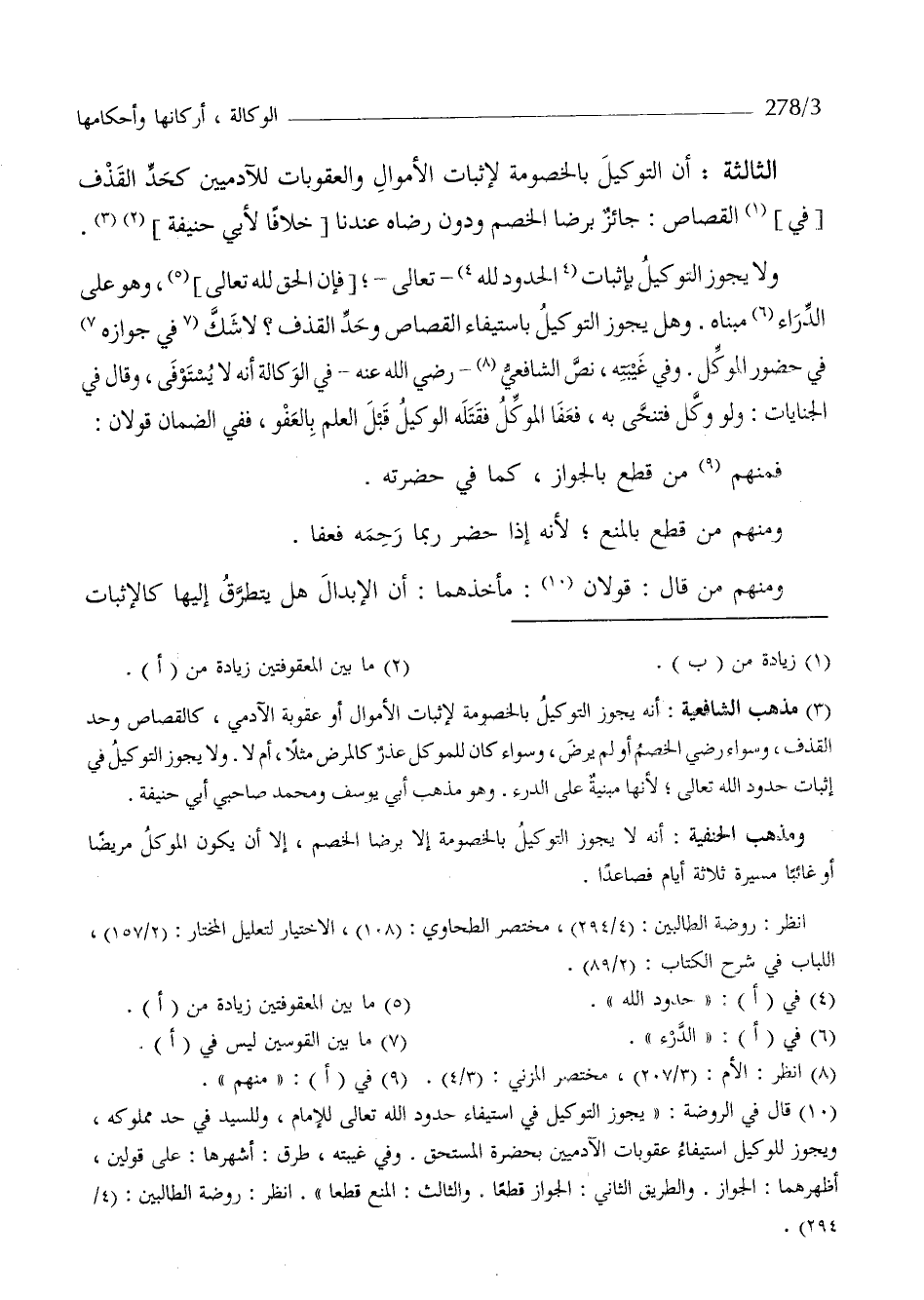 الثَّالِثَة أَن التَّوْكِيل بِالْخُصُومَةِ لإِثْبَات الْأَمْوَال والعقوبات للآدميين كَحَد الْقَذْف فِي الْقصاص جَائِز بِرِضا الْخصم وَدون رِضَاهُ عندنَا خلافًا لأبي حنيفَة