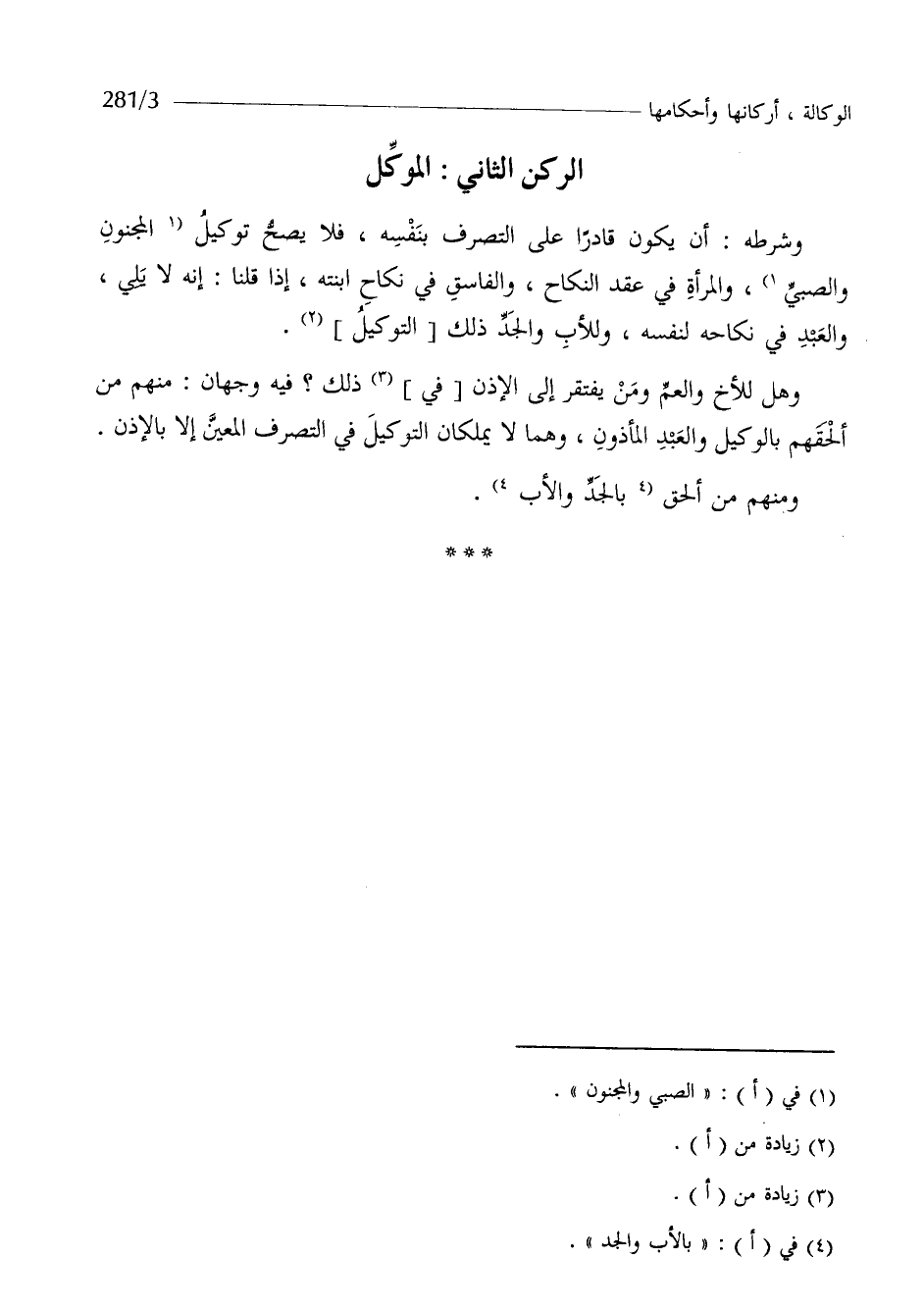 وَشَرطه أَن يكون قَادِرًا على التَّصَرُّف بِنَفسِهِ فَلَا يَصح تَوْكِيل المحنون وَالصَّبِيّ وَالْمَرْأَة فِي عقد النِّكَاح وَالْفَاسِق فِي نِكَاح ابْنَته إِذا قُلْنَا إِنَّه لَا يَلِي وَالْعَبْد فِي نِكَاحه لنَفسِهِ وَللْأَب وَالْجد ذَلِك التَّوْكِيل