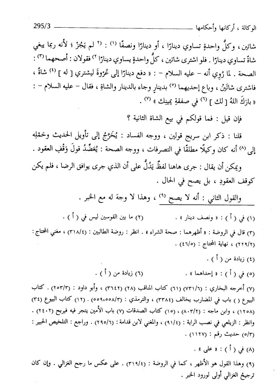 شَاتين وكل وَاحِدَة تَسَاوِي دِينَارا أَو دِينَارا وَنصفا لم يجز لِأَنَّهُ رُبمَا يَبْغِي شَاة تَسَاوِي دِينَارا فَلَو اشْترى شَاتين كل وَاحِدَة يُسَاوِي دِينَارا فَقَوْلَانِ أصَحهمَا الصِّحَّة لما رُوِيَ أَنه عَلَيْهِ السَّلَام دفع دِينَارا إِلَى عُرْوَة ليَشْتَرِي لبه شَاة فاشتري شَاتين وَبَاعَ إحديهما بِدِينَار وَجَاء بِدِينَار وَالشَّاة فَقَالَ عَلَيْهِ السَّلَام بَارك الله لَك فِي صَفْقَة يَمِينك