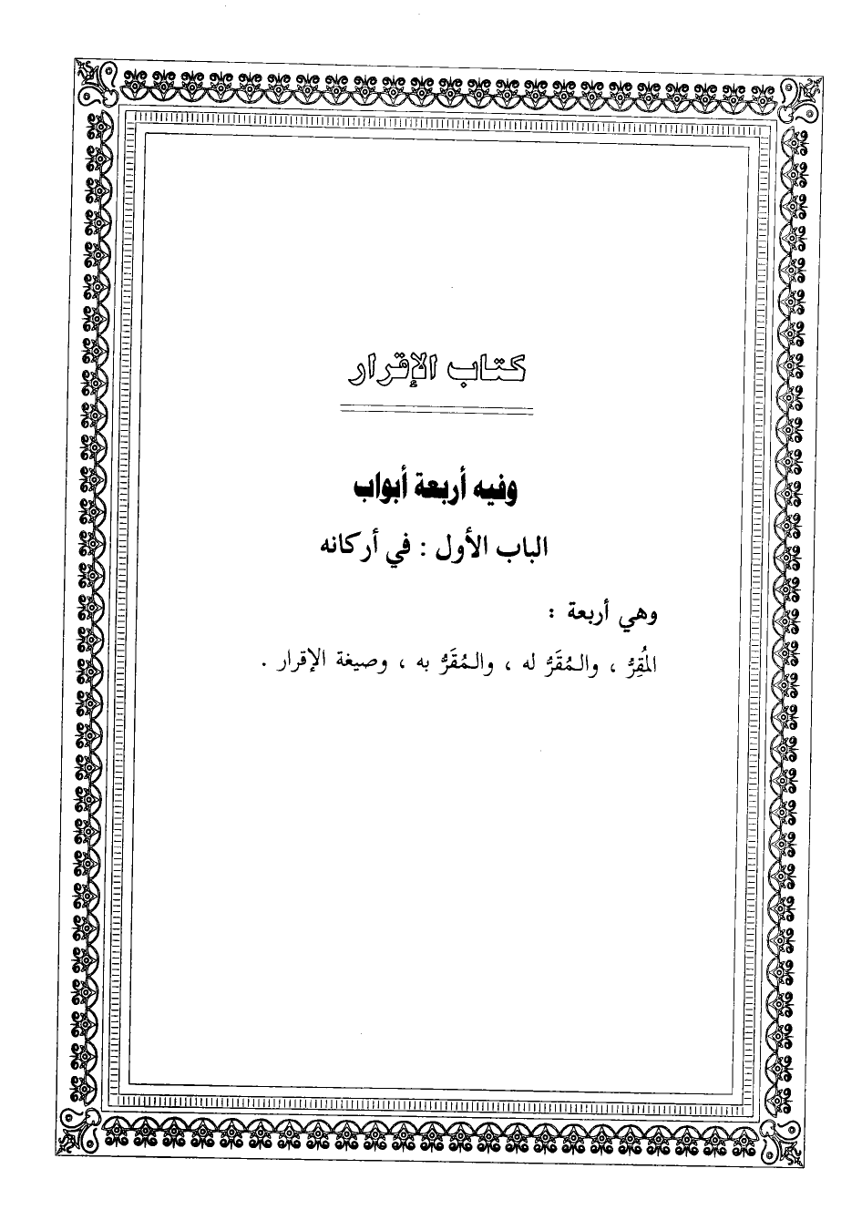 = كتاب الْإِقْرَار وَفِيه أَرْبَعَة أَبْوَاب = - صَلَّى اللَّهُ عَلَيْهِ وَسَلَّم َ - الْبَاب الأول فِي أَرْكَانه - صَلَّى اللَّهُ عَلَيْهِ وَسَلَّم َ - وَهِي أَرْبَعَة الْمقر وَالْمقر لَهُ وَالْمقر بِهِ وَصِيغَة الْإِقْرَار