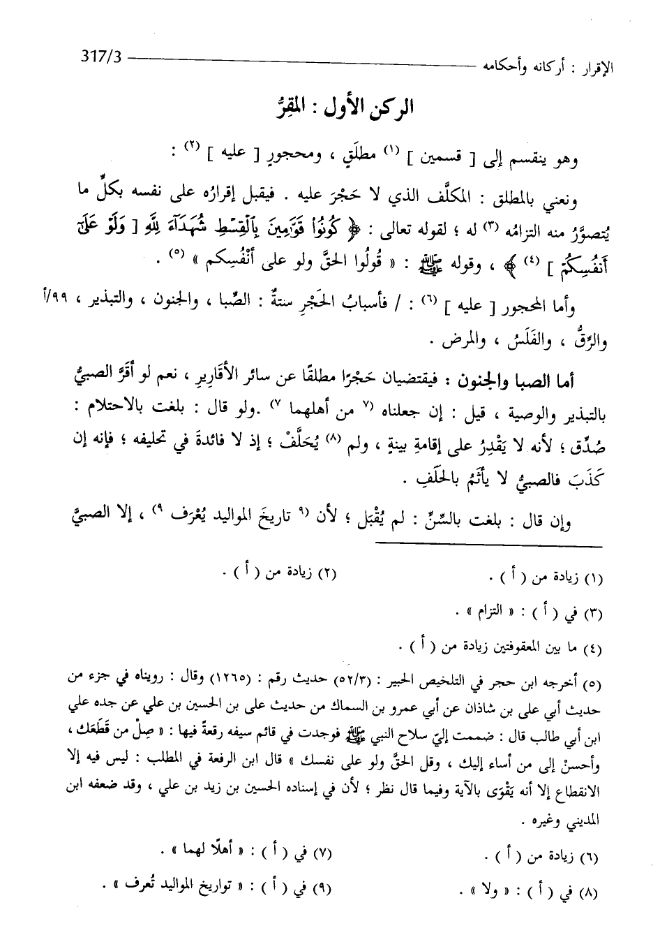 ونعني بالمطلق الْمُكَلف الَّذِي لَا حجر عَلَيْهِ فَيقبل إِقْرَاره على نَفسه بِكُل مَا يتَصَوَّر مِنْهُ الْتِزَامه لَهُ لقَوْله تَعَالَى {كونُوا قوامين بِالْقِسْطِ شُهَدَاء لله وَلَو على أَنفسكُم} وَقَوله صلى الله عَلَيْهِ وَسلم قُولُوا الْحق وَلَو على أَنفسكُم