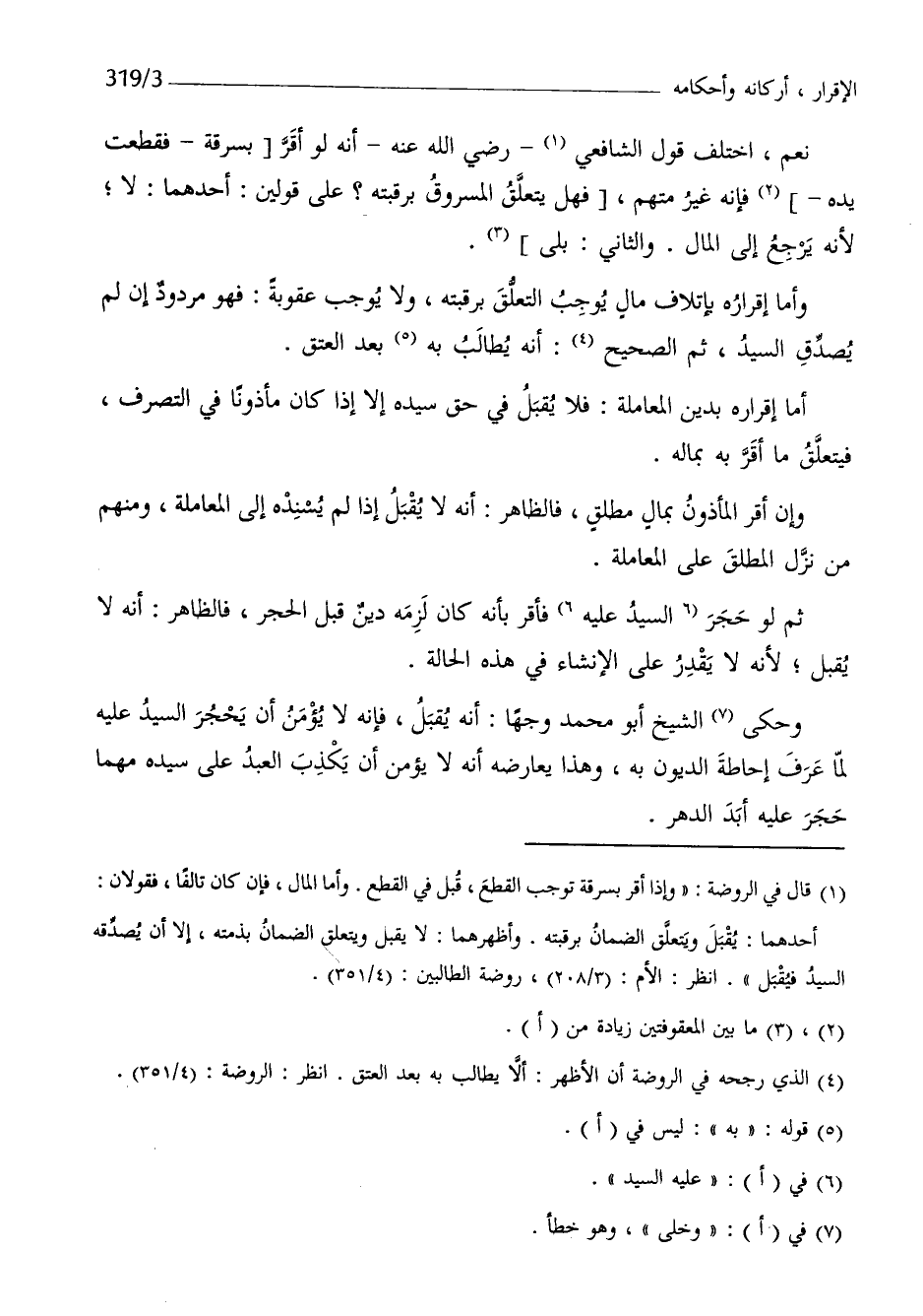وَأما إِقْرَاره بِإِتْلَاف مَال يُوجب التَّعَلُّق بِرَقَبَتِهِ وَلَا يُوجب عُقُوبَة فَهُوَ مَرْدُود إِن لم يصدق السَّيِّد ثمَّ الصَّحِيح أَنه يُطَالب بِهِ بعد الْعتْق أما إِقْرَاره بدين الْمُعَامَلَة فَلَا يقبل فِي حق سَيّده إِلَّا إِذا كَانَ مَأْذُونا فِي التَّصَرُّف فَيتَعَلَّق مَا أقرّ بِهِ بِمَالِه