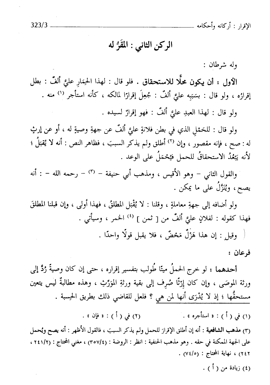 الأول أَن يكون محلا للاستحقاق فَلَو قَالَ لهَذَا الْحمار عَليّ ألف بَطل إِقْرَاره وَلَو قَالَ بِسَبَبِهِ عَليّ ألف جعل إِقْرَارا لمَالِكه كَأَنَّهُ اسْتَأْجر مِنْهُ