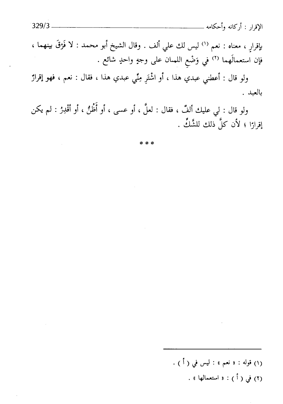 بِإِقْرَار مَعْنَاهُ نعم لَيْسَ لَك على ألف وَقَالَ الشَّيْخ أَبُو مُحَمَّد لَا فرق بَينهمَا فَإِن استعمالهما فِي وضع اللِّسَان على وَجه وَاحِد شَائِع وَلَو قَالَ أَعْطِنِي عَبدِي هَذَا أَو اشْتَرِ مني عَبدِي هَذَا فَقَالَ نعم فَهُوَ إِقْرَار بِالْعَبدِ