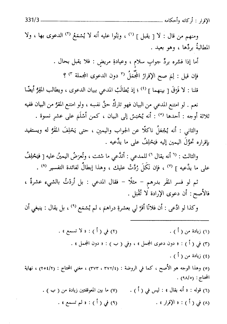 قُلْنَا لَا فرق بَينهمَا إِذْ يُطَالب الْمُدَّعِي بِبَيَان الدَّعْوَى وَيُطَالب الْمقر أَيْضا نعم لَو امْتنع الْمُدَّعِي من الْبَيَان فَهُوَ تَارِك حق نَفسه لَو امْتنع الْمقر من البييان فَفِيهِ ثَلَاثَة أوجه أَحدهَا أَنه يحبس إِلَى الْبَيَان كمن أسلم على عشر نسْوَة