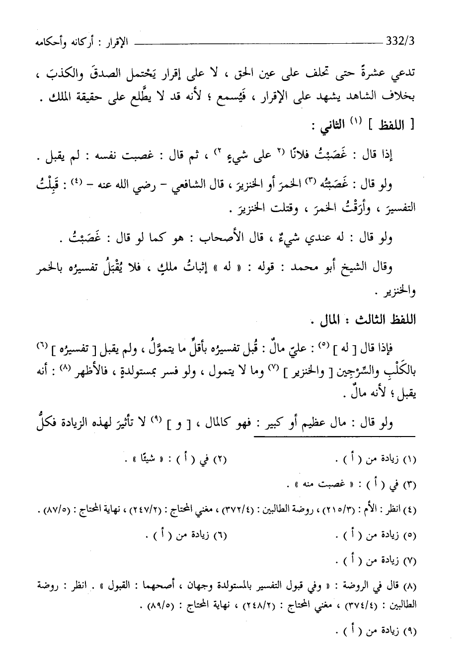 وَقَالَ الشَّيْخ أَبُو مُحَمَّد قَوْله لَهُ إِثْبَات ملك فَلَا يقبل تَفْسِيره بِالْخمرِ وَالْخِنْزِير اللَّفْظ الثَّالِث المَال