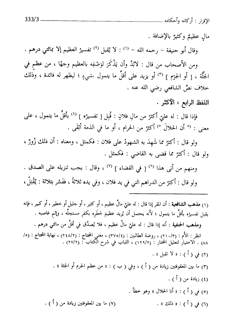 فَإِذا قَالَ لَهُ عَليّ أَكثر من مَال فلَان قبل بتفسيره بِأَقَلّ مَا يتمول على معنى أَن الْحَلَال أَكثر من الْحَرَام أَو مَا فِي الذِّمَّة أبقى