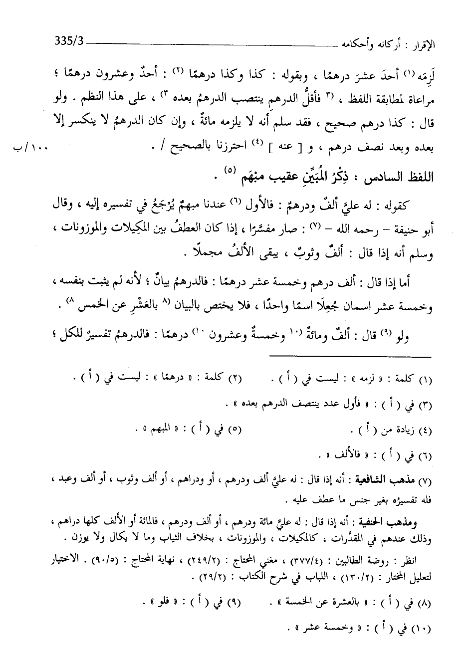 لزمَه أحد عشر درهما وَبِقَوْلِهِ كَذَا وَكَذَا درهما أحد وَعِشْرُونَ درهما مُرَاعَاة لمطابقة اللَّفْظ فَأَقل الدره ينْتَصب الدِّرْهَم بعده على هَذَا النّظم وَلَو قَالَ كَذَا دِرْهَم صَحِيح فقد سلم أَنه لَا يلْزمه مائَة وَإِن كَانَ الدِّرْهَم لَا ينكسر إِلَّا بعده وَبعد نصف دِرْهَم عَنهُ احترزنا بِالصَّحِيحِ اللَّفْظ السَّادِس ذكر الْمُبين عقيب مُبْهَم