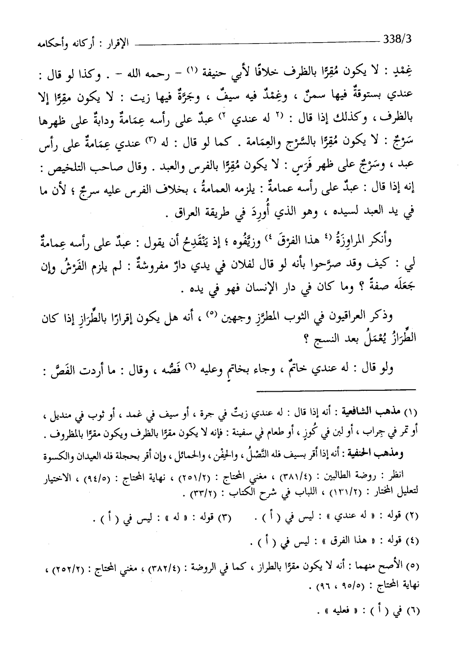غمد لَا يكون مقرا بالظرف خلافًا لأبي حنيفه رَحمَه الله وَكَذَا لَو قَالَ عِنْدِي بستوقة فِيهَا سمن وغمد فِيهِ سيف وجرة فِيهَا زَيْت لَا يكون مقرا الا بالظرف وَكَذَلِكَ إِذا قَالَ لَهُ عِنْدِي عبد على رَأسه عِمَامَة ودابة على ظهرهَا سرج لَا يكون مقرا بالفرس وَالْعَبْد كَمَا لَو قَالَ لَهُ عِنْدِي عِمَامَة على رَأس عبد وسرج على ظهر فرس لايكون مقرا بالفرس وَالْعَبْد وَقَالَ صَاحب التَّلْخِيص إِنَّه إِذا قَالَ عبد على رَأسه عِمَامَة يلْزمه الْعِمَامَة بِخِلَاف الْفرس عَلَيْهِ سرج لِأَن مَا فِي يَد العَبْد لسَيِّده وَهُوَ الَّذِي أورد فِي طَريقَة الْعرَاق