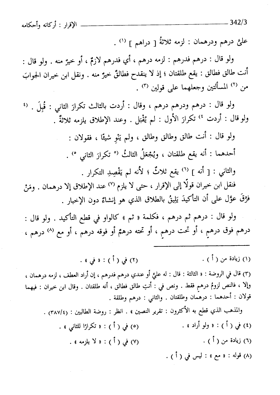 فَنقل أبن خيران قولا إِلَيّ الاقرار حَتَّى لَا يلْزم عِنْد الاطلاق الا دِرْهَمَانِ وَمن فرق عول على ان التَّأْكِيد يَلِيق بِالطَّلَاق الَّذِي هُوَ إنْشَاء دون الْأَخْبَار