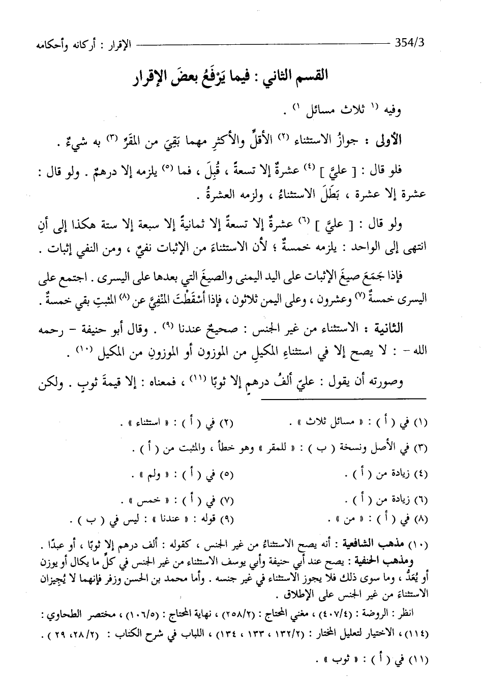 الأولى جَوَاز الِاسْتِثْنَاء الْأَقَل وَالْأَكْثَر مهما بَقِي من الْمقر بِهِ شَيْء