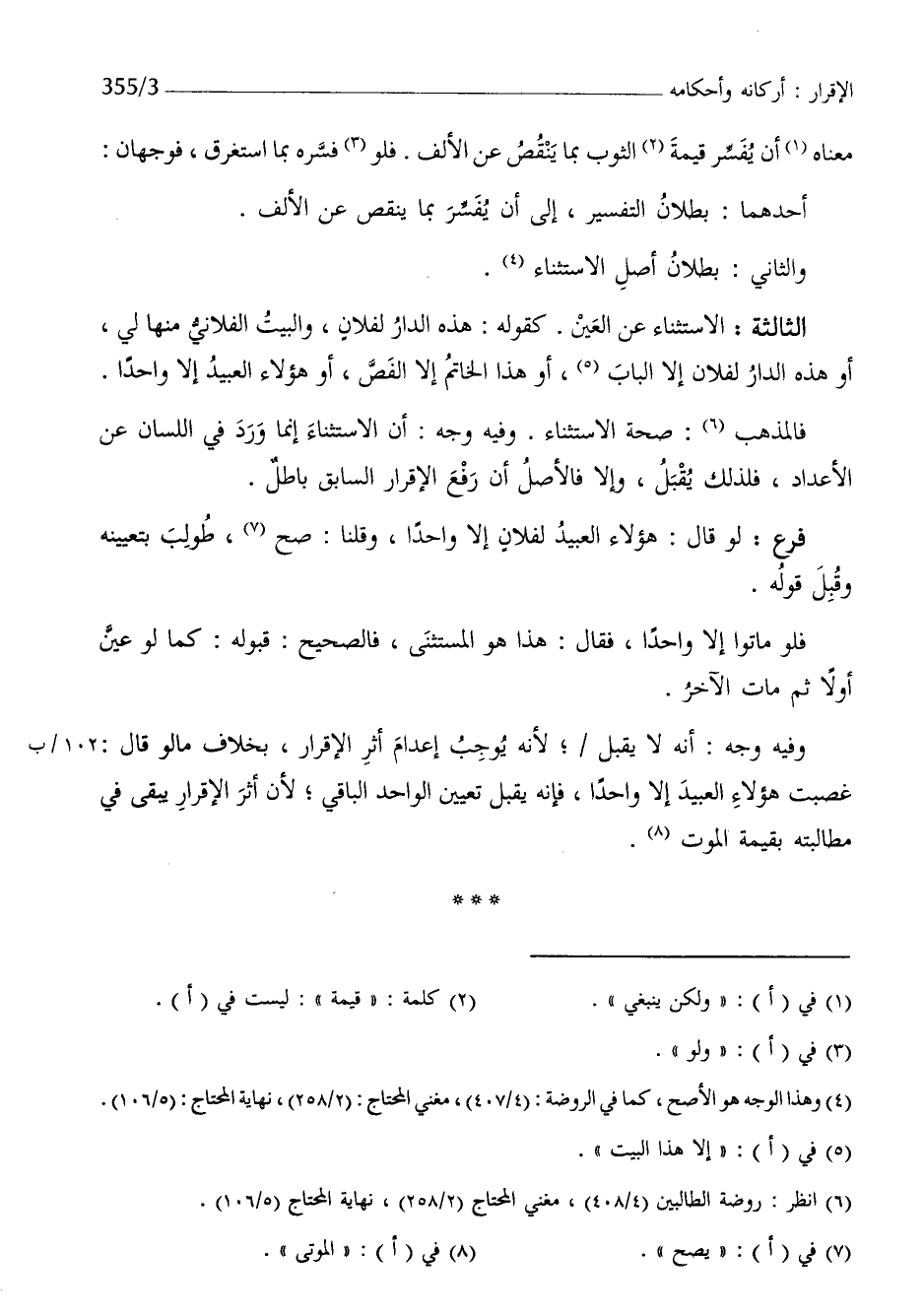 الثَّالِثَة الِاسْتِثْنَاء عَن الْعين كَقَوْلِه هَذِه الدَّار لفُلَان وَالْبَيْت الْفُلَانِيّ مِنْهَا لي أَو هَذِه الدَّار لفُلَان إِلَّا الْبَاب أَو هَذَا الْخَاتم إِلَّا الفص أَو هَؤُلَاءِ العبيد إِلَّا وَاحِدًا
