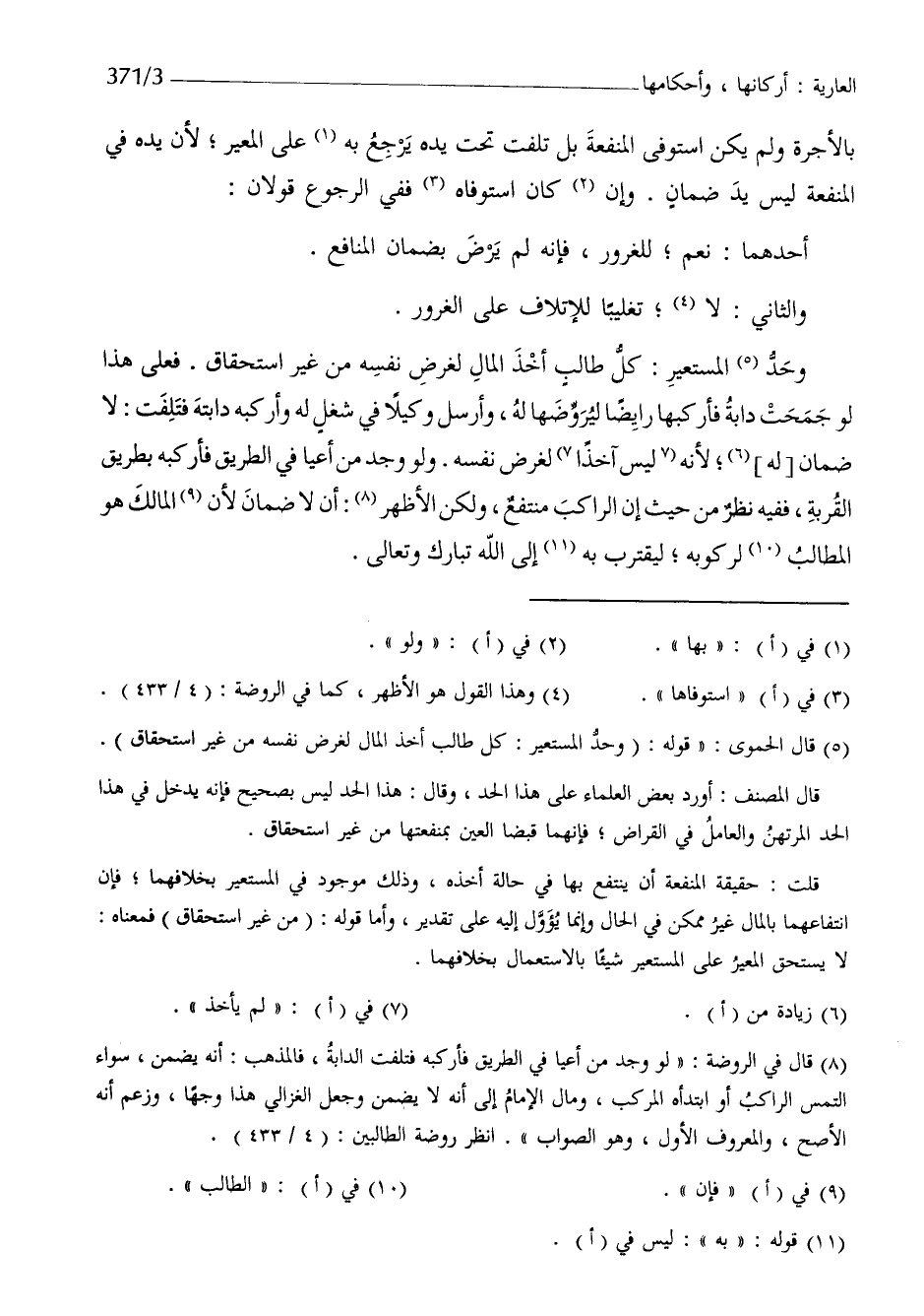 وحد الْمُسْتَعِير كل طَالب أَخذ المَال لغَرَض نَفسه من غير اسْتِحْقَاق فعلى هَذَا لَو جمحت دَابَّة فأركبها ر أَيْضا ليروضها لَهُ وارسل وَكيلا فِي شغل لَهُ واركبه دَابَّته وفتلفت لَا ضَمَان لَهُ لِأَنَّهُ لَيْسَ آخِذا لغَرَض نَفسه وَلَو وجد من اعيا فِي الطَّرِيق فأركبه بطرِيق الْقرْبَة فَفِيهِ نظر من حَيْثُ أَن الرَّاكِب منتفع وَلَكِن الْأَظْهر أَن لَا ضَمَان لِأَن الْمَالِك هُوَ المطالب لركوبه ليقترب بِهِ الى الله تبَارك وَتَعَالَى