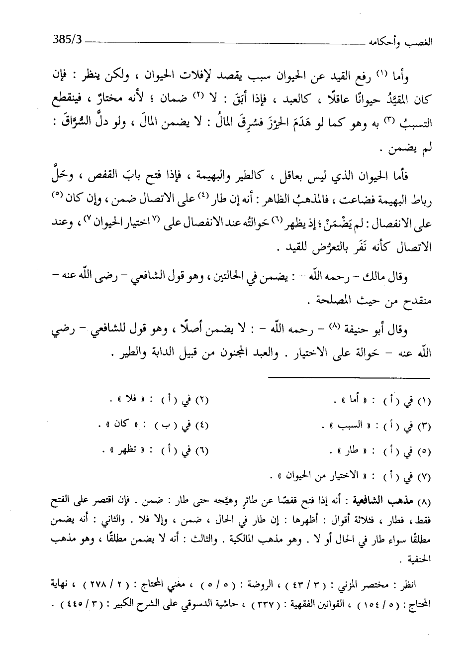 فَأَما الْحَيَوَان الَّذِي لَيْسَ بعاقل كالطير والبهيمة فَإِذا فتح بَاب القفص وَحل رِبَاط الْبَهِيمَة فَضَاعَت فَالْمَذْهَب الظَّاهِر أَنه إِن طَار على الِاتِّصَال ضمن وَإِن كَانَ على الِانْفِصَال لم يضمن إِذْ يظْهر حوالته عِنْد الِانْفِصَال على اخْتِيَار الْحَيَوَان وَعند الِاتِّصَال كَأَنَّهُ نفر بالتعرض للقيد