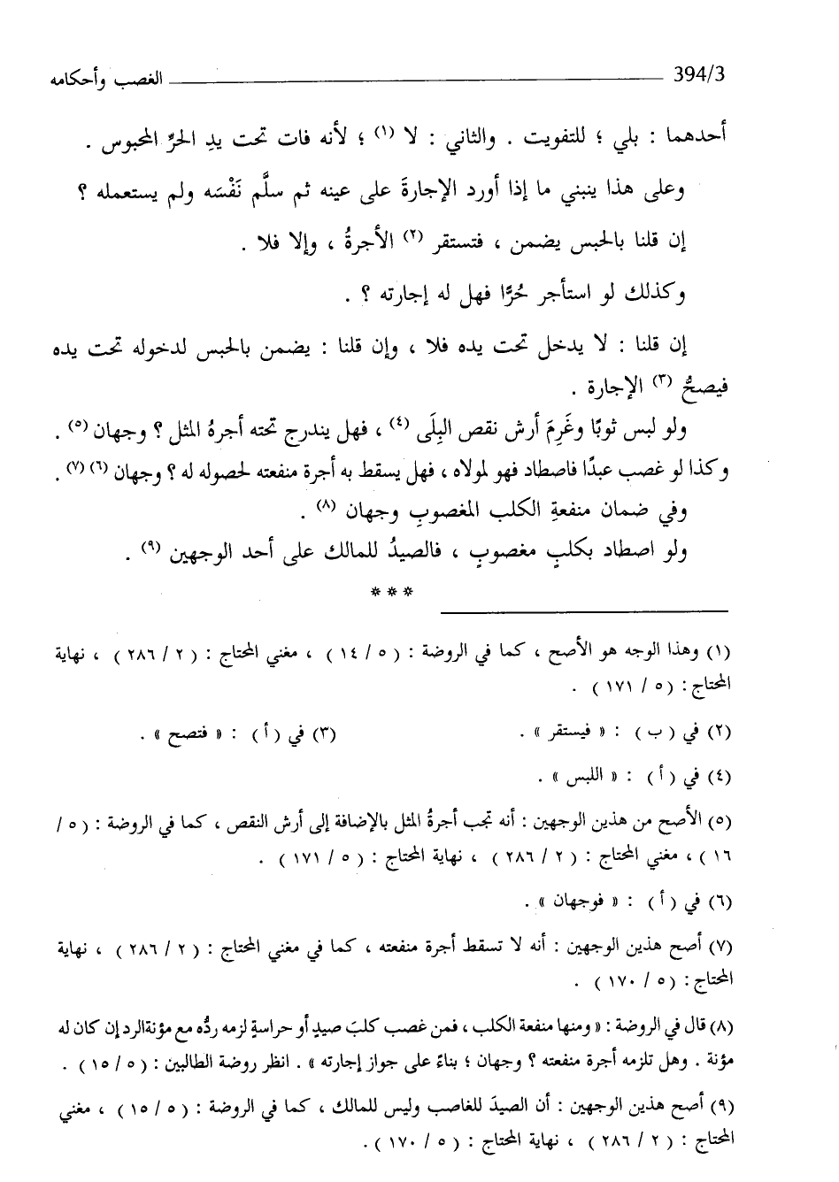 وَفِي ضَمَان مَنْفَعَة الْكَلْب الْمَغْصُوب وَجْهَان