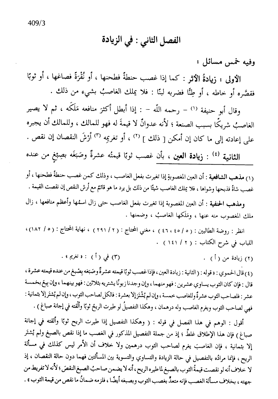 وَفِيه خمس مسَائِل الأولى زِيَادَة الْأَثر كَمَا إِذا غصب حِنْطَة فطحنها أَو نقرة فصاغها أَو ثوبا فَقَصره أَو خاطه أَو طنا فَضَربهُ لَبَنًا فَلَا يملك الْغَاصِب شَيْء من ذَلِك