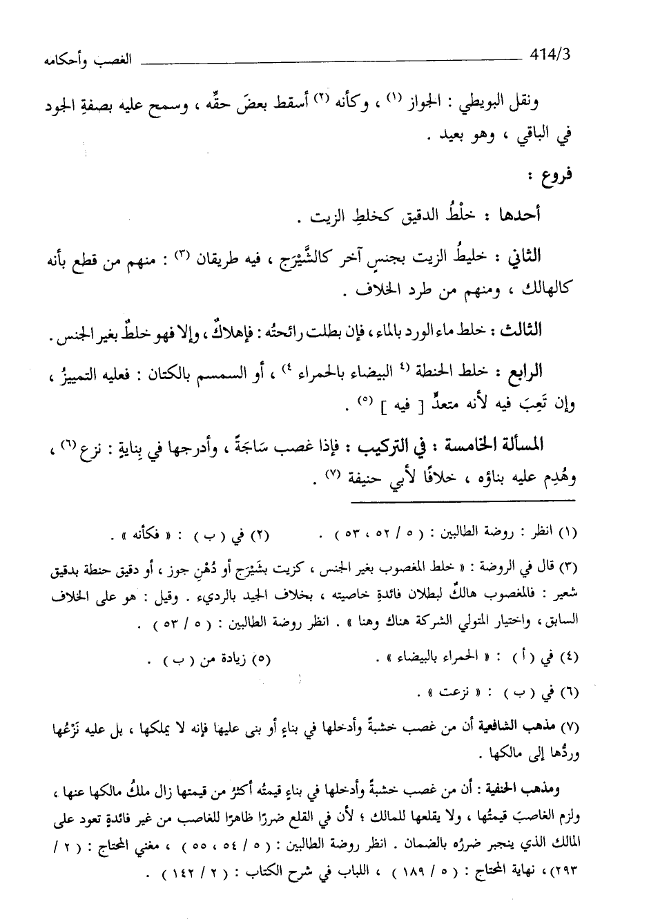 وَنقل الْبُوَيْطِيّ الْجَوَاز وَكَأَنَّهُ أسقط بعض حَقه وسمح عَلَيْهِ بِصفة الْجُود فِي الْبَاقِي وَهُوَ بعيد فروع أَحدهَا خلط الدَّقِيق كخلط الزَّيْت الثَّانِي خليط الزَّيْت بِجِنْس آخر كالشيرج فِيهِ طَرِيقَانِ مِنْهُم من قطع بِأَنَّهُ كالهالك وَمِنْهُم من طرد الْخلاف الثَّالِث خلط مَاء الْورْد بِالْمَاءِ فَإِن بطلت رَائِحَته فإهلاك وَإِلَّا فَهُوَ خلط بِغَيْر الْجِنْس الرَّابِع خلط الْحِنْطَة الْبَيْضَاء بالحمراء أَو السمسم بالكتان فَعَلَيهِ التَّمْيِيز وَإِن تَعب فِيهِ لِأَنَّهُ مُتَعَدٍّ فِيهِ الْمَسْأَلَة الْخَامِسَة فِي التَّرْكِيب فَإِذا غصب ساجة وأدرجها فِي بناية نزع وَهدم عَلَيْهِ بِنَاؤُه خلافًا لأبي حنيفَة