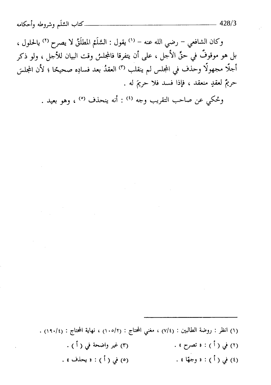 وَكَانَ الشَّافِعِي رَضِي الله عَنهُ يَقُول السّلم الْمُطلق لَا يُصَرح بالحلول بل هُوَ مَوْقُوف فِي حق الْأَجَل على أَن يَتَفَرَّقَا فالمجلس وَقت البينان للأجل وَلَو ذكر أَََجَلًا مَجْهُولا وَحذف فِي الْمجْلس لم يَنْقَلِب العقد بعد فَسَاده صَحِيحا لِأَن الْمجْلس حَرِيم لعقد مُنْعَقد فَإِذا فسد فَلَا حَرِيم لَهُ وَحكي عَن صَاحب التَّقْرِيب وَجه أَنه ينحذف وَهُوَ بعيد