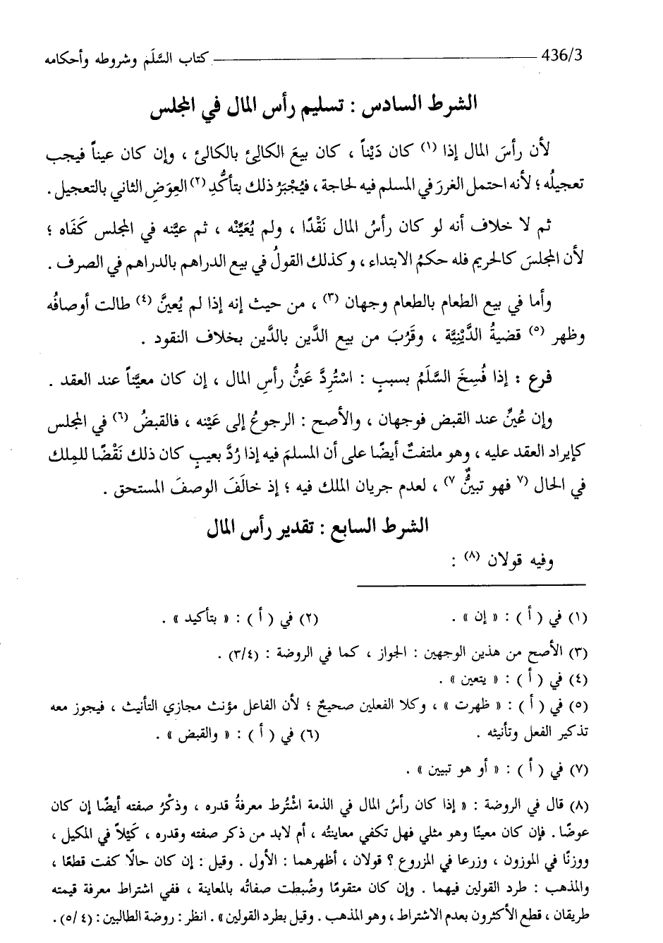 الشَّرْط السَّادِس تَسْلِيم رَأس المَال فِي الْمجْلس